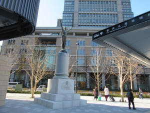 東京駅前の「愛の像」 東京駅南口(丸の内側)に両手を天に突きだしたブロンズ像「愛(アガペー)の像」が再設置された。台座に刻まれている「愛」の文字は、戦争犯罪人(戦犯)を収容した巣鴨プリズンの教誨師だった真言宗豊山派僧侶で大正大学教授だった田嶋隆純(1892―1957)が揮毫。東京駅周辺の再開発のため10年余り、別の場所で保管されていた。昨年11月末に設置され、12月7日の駅前整備完了後から注目されるようになった。