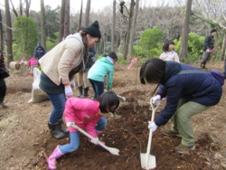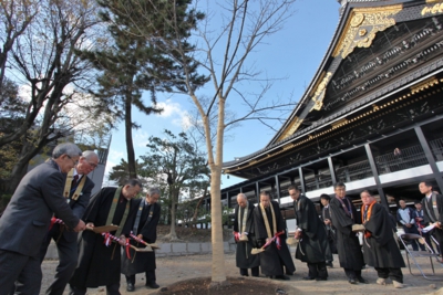 阿弥陀堂近くに植えられた若木に土をかける大谷暢顯門首(中央の木の右)ら 真宗大谷派高山別院(岐阜県高山市)の前身、旧荘川村の照蓮寺にかつて植わっていて、ダム建設に伴い移植された「荘川桜」の「2世」が本山東本願寺に2本植樹され、12月11日、京都市下京区の同寺で植樹式が行われた。高山教区や本山の関係者ら約130人が見守る中、大谷暢顕門首らが若木に土をかけた。