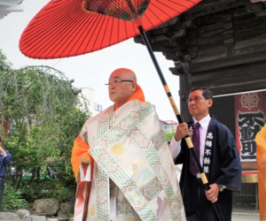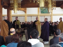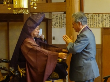 齋藤弘道・善通寺執行長(同派宗務総長)が、満堂の参列者330人に謝辞。その半生を善通寺と同派の興隆に捧げてきた菅法主の経歴を挙げ、「最も善通寺を知る方。この経験豊かな管長猊下を先頭に弘法大師御誕生1250年記念大法会に向けて邁進していく所存」と述べた。