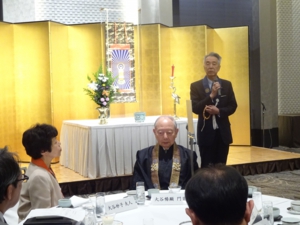 乾杯後の祝宴では、東本願寺独派結成時の様子を担当弁護士がスピーチしたほか、全国的にも有名になった牛久大仏の建立エピソードが施工業者から紹介された。