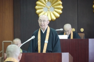 選出後、中川新総長が挨拶。降誕800年の慶讃事業の始動や災害対策などに的確な対応をしてきた小林前総長に対して感謝を述べた。「その重責を引き継ぎ、宗政宗務を全うするには各聖のご協力が不可欠」と宗門僧侶すべてに期待した。