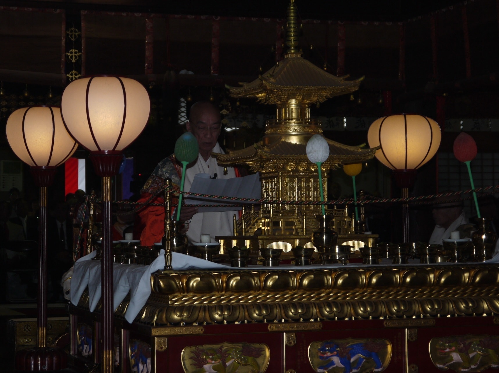 葬儀は斎場を借りず、寺院本堂で行う。参加者も内陣に花で荘厳された祭壇を見て「凄く立派」と感心の様子を示し、青年僧の説明を食い入るように聞いた。