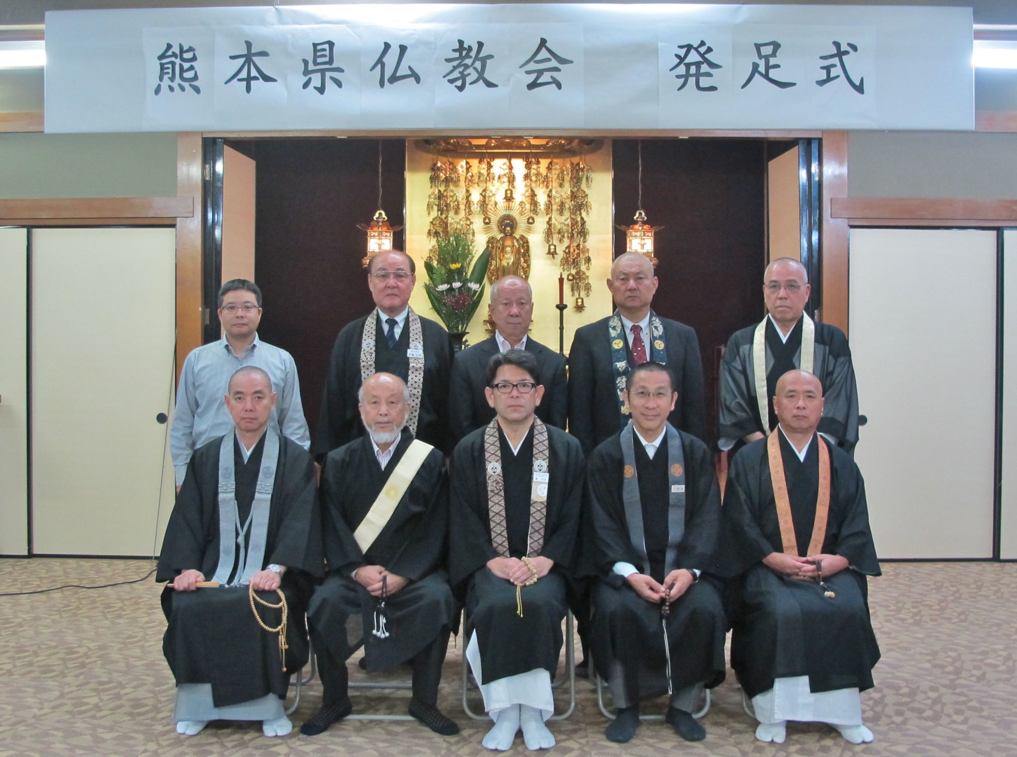 5宗派・2団体が加盟した熊本県仏の発足式 熊本地震をきっかけに、県内の5宗派と2団体が加盟する熊本県仏教会が10月に発足し、公益財団法人全日本仏教会(全日仏、釜田隆文理事長)への加盟が26日、京都市内で開かれた理事会で承認された。全日仏への新規加盟団体は約15年ぶり。11月末に熊本県仏にさらに2宗派が加盟する予定だ。