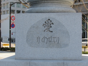 東京駅前の「愛の像」 東京駅南口(丸の内側)に両手を天に突きだしたブロンズ像「愛(アガペー)の像」が再設置された。台座に刻まれている「愛」の文字は、戦争犯罪人(戦犯)を収容した巣鴨プリズンの教誨師だった真言宗豊山派僧侶で大正大学教授だった田嶋隆純(1892―1957)が揮毫。東京駅周辺の再開発のため10年余り、別の場所で保管されていた。昨年11月末に設置され、12月7日の駅前整備完了後から注目されるようになった。