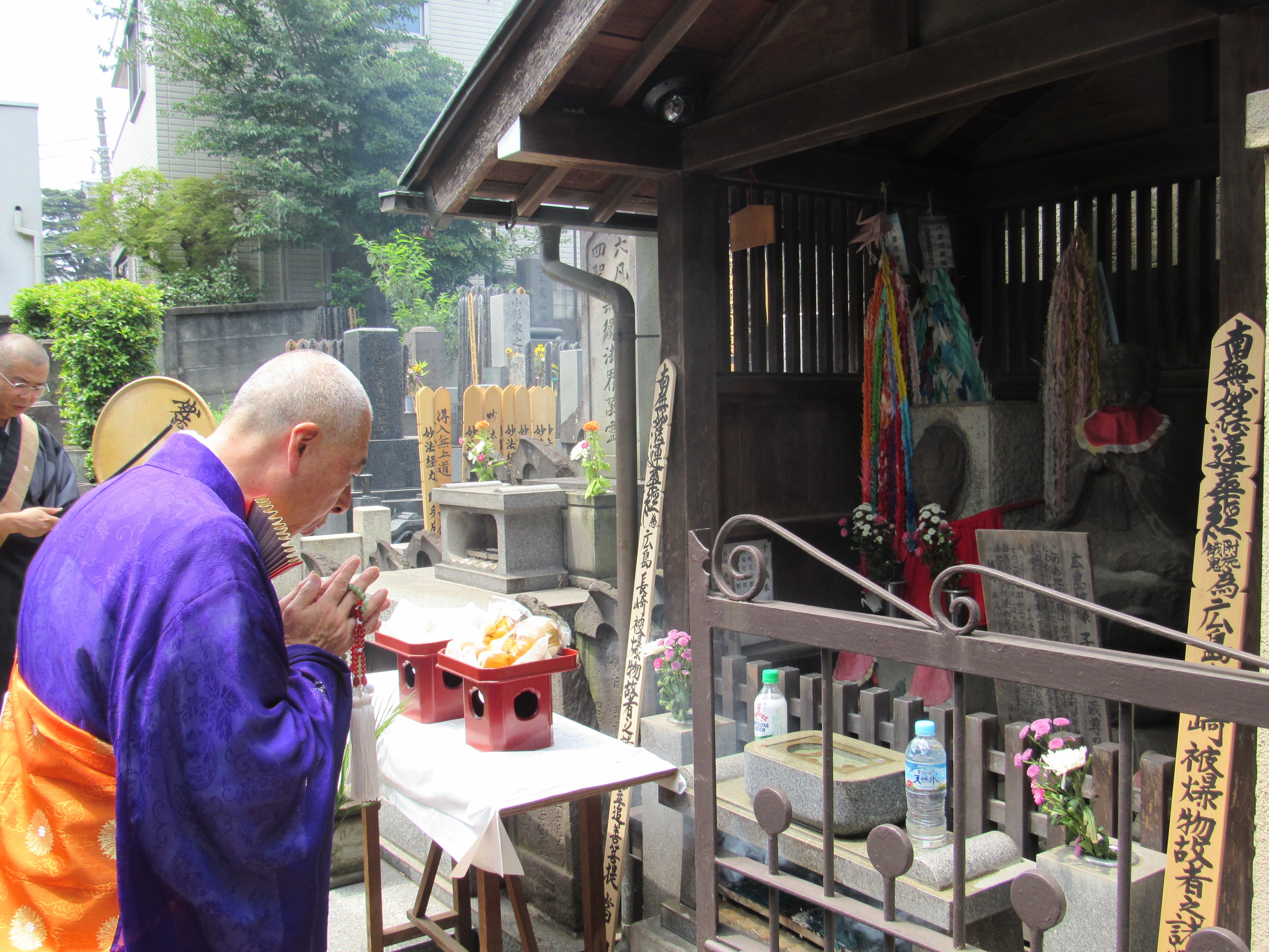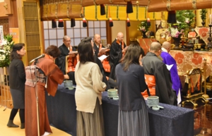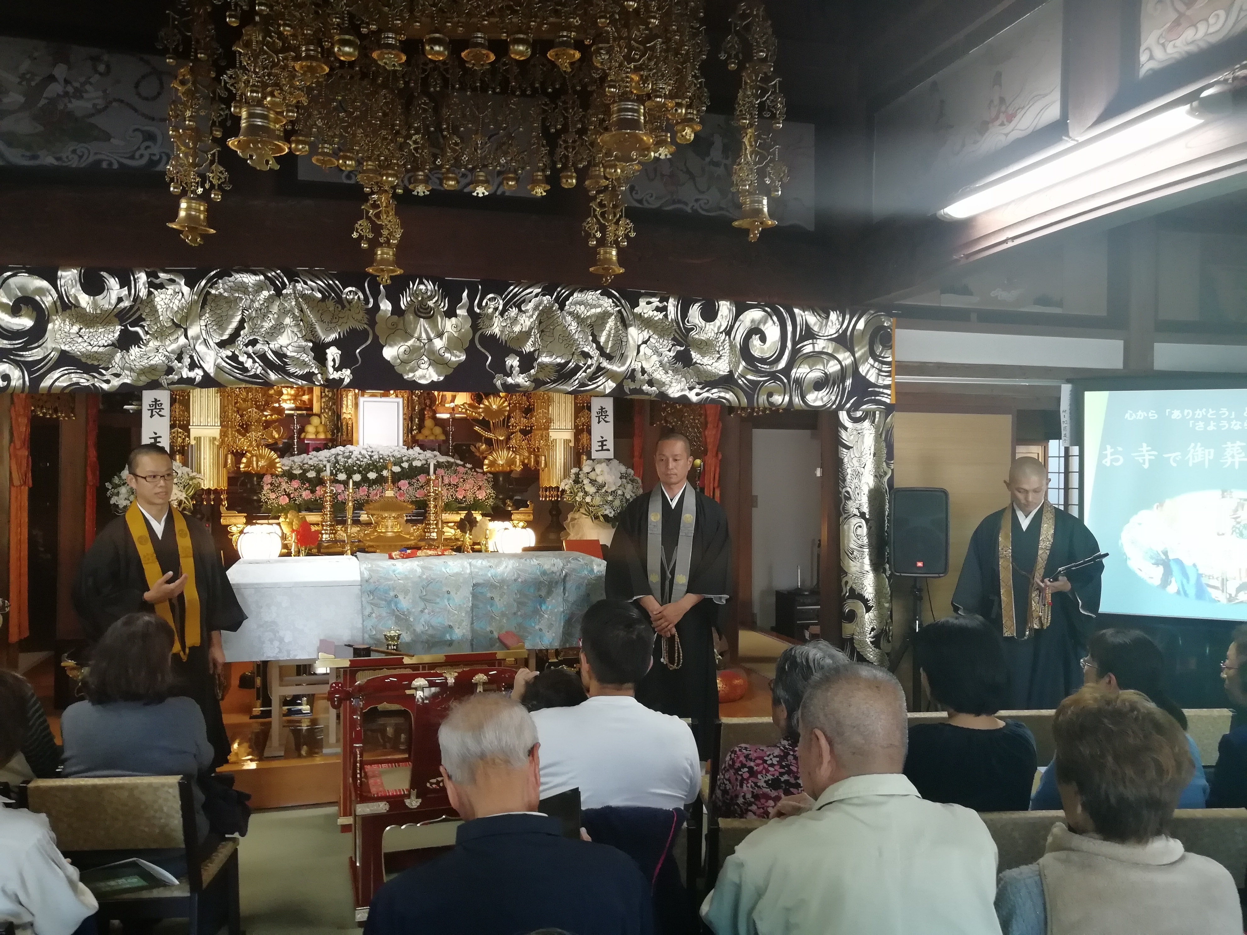 葬儀は斎場を借りず、寺院本堂で行う。参加者も内陣に花で荘厳された祭壇を見て「凄く立派」と感心の様子を示し、青年僧の説明を食い入るように聞いた。