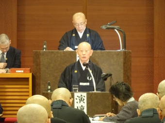 選出後、中川新総長が挨拶。降誕800年の慶讃事業の始動や災害対策などに的確な対応をしてきた小林前総長に対して感謝を述べた。「その重責を引き継ぎ、宗政宗務を全うするには各聖のご協力が不可欠」と宗門僧侶すべてに期待した。