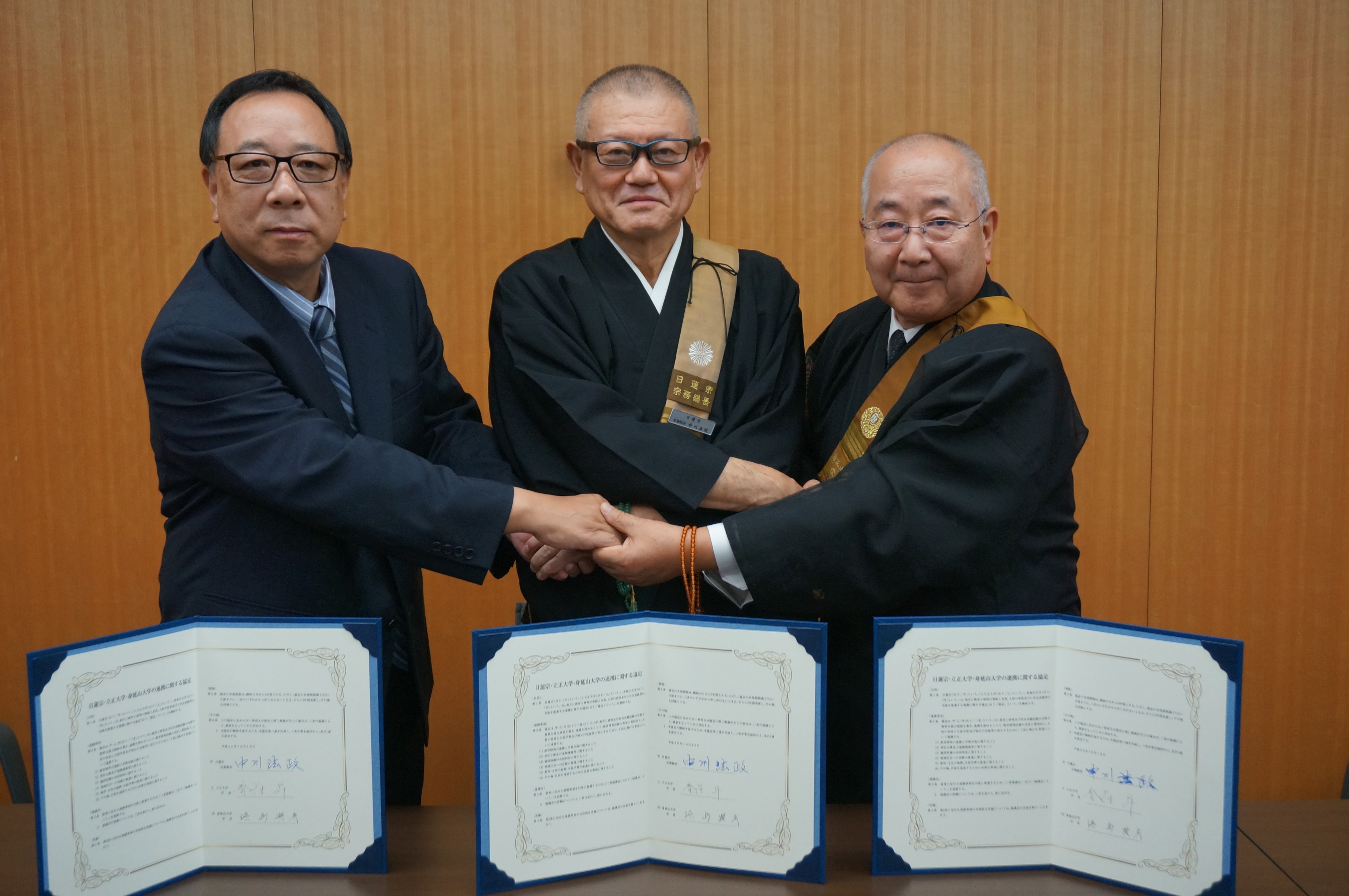 認証式は20日に宗務院で行われた。中川新総長は寺院を取り巻く状況が悪化している中、「強い日蓮宗」を目標に掲げた。「体質的にも絆においても、色々な面で強いということ。その強さの源は異体同心であります」と述べ、僧俗一体で宗祖の祖願達成のために邁進することを誓った。