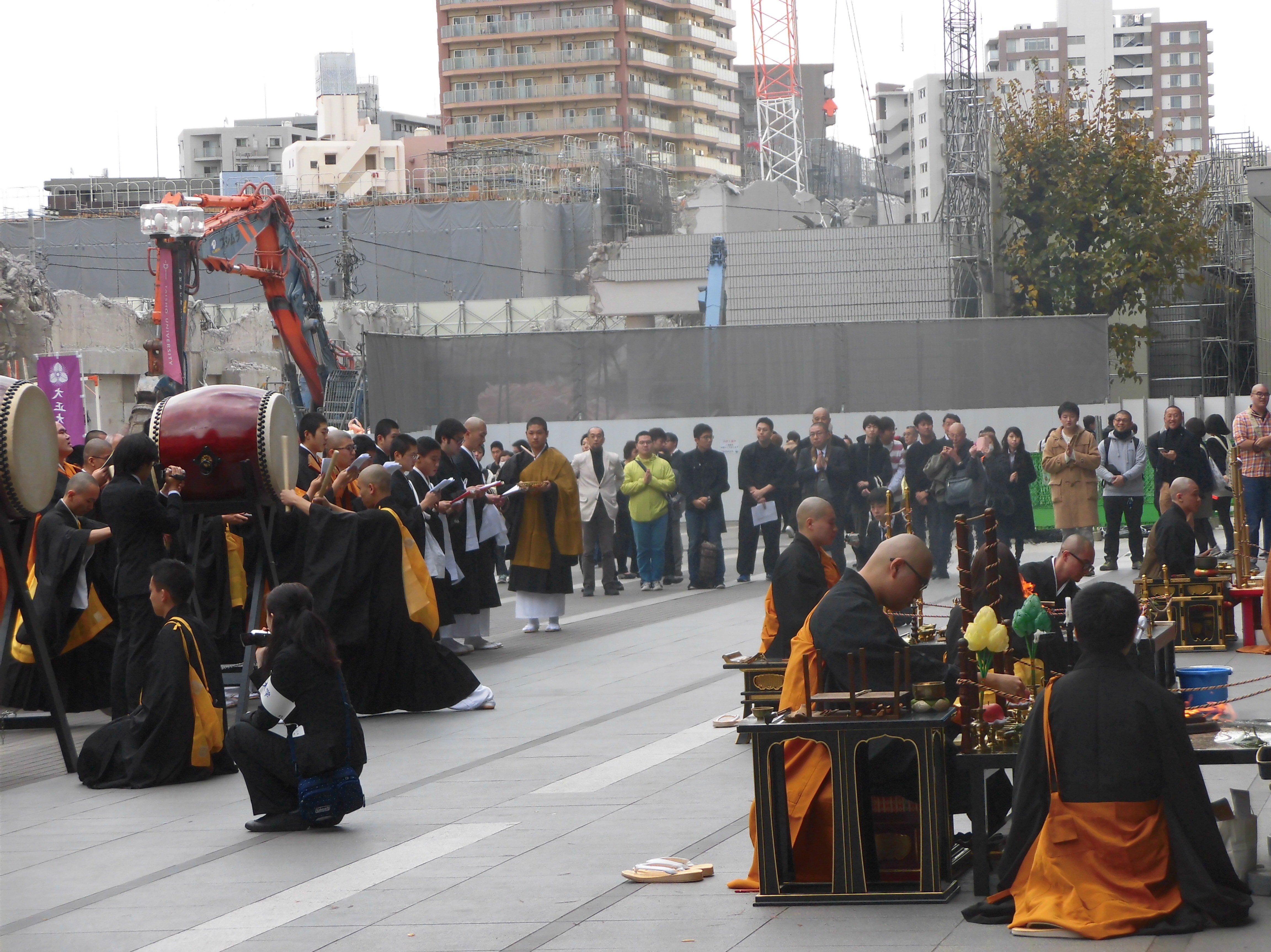学生の護摩や太鼓が盛り上げた法要。後方は解体中の礼拝堂 大正大学(東京都豊島区西巣鴨)では5日、成道会を厳修した。主催は仏教学部の学生を中心とする成道会実行委員会。テーマを「ハーモニー 祈りの輪」とし、宗派を超えた祈りのエネルギーを発揮した。