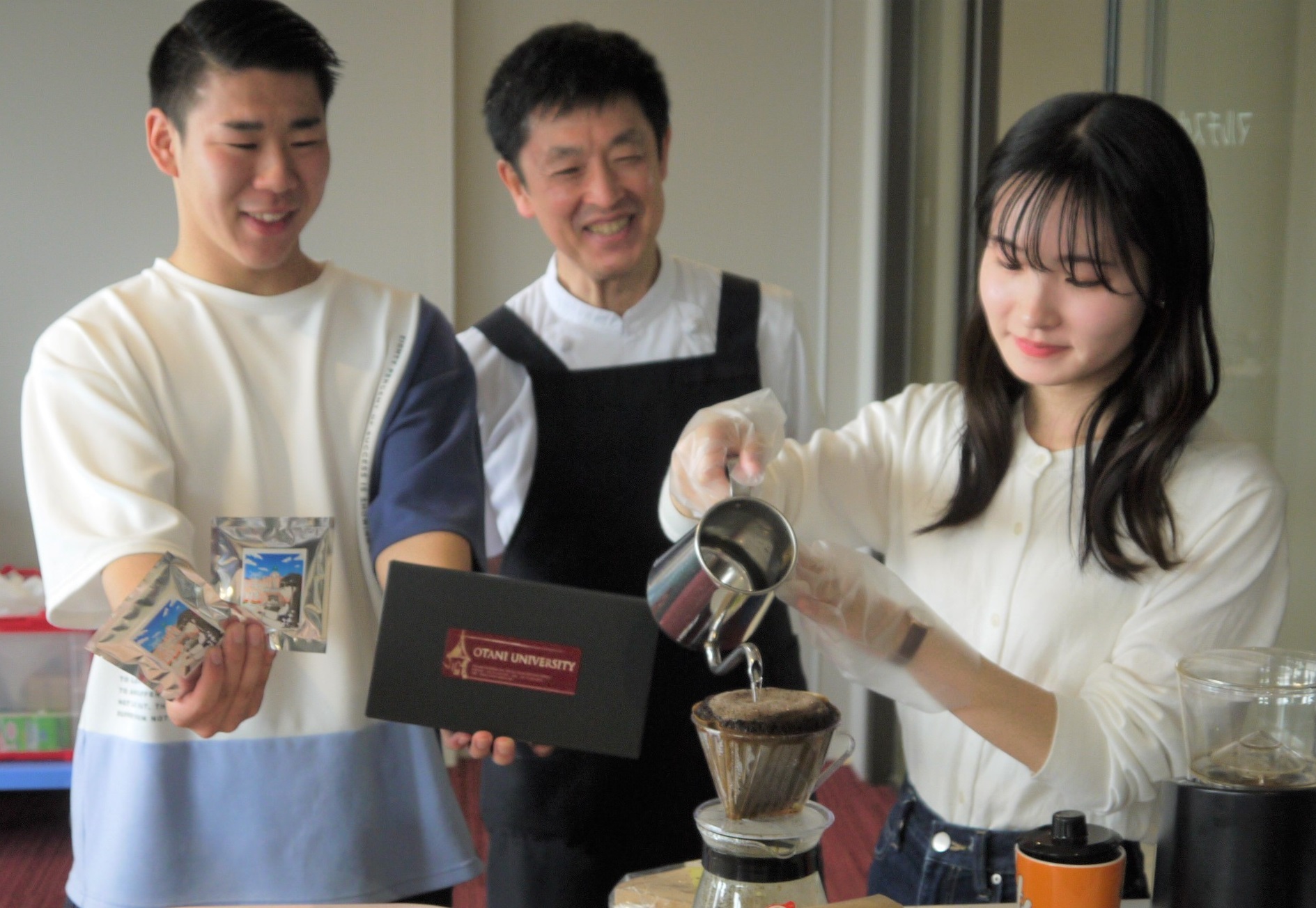 楽しそうにコーヒーを淹れる嶌本さんと伊藤珈琲の伊藤達店長、中野さん 真宗大谷派の宗門校・大谷大学(京都市北区)で6月20日、学生が主体となって制作したオリジナルコーヒー「尋(じん)珈琲(コーヒー)」の完成披露・試飲会が開催された。現在の学生たちの大学生活をコロナ禍が直撃。様々な交流活動が制限されてきた中で、学生会が新コーヒーの開発プロジェクトを通して、全学生、全教職員、商店街の繋がりを再強化。コロナ明けの新たな大谷大学を象徴する爽やかな香りと味わいに仕上げ、今月から同大近くの伊藤珈琲で販売を開始した。