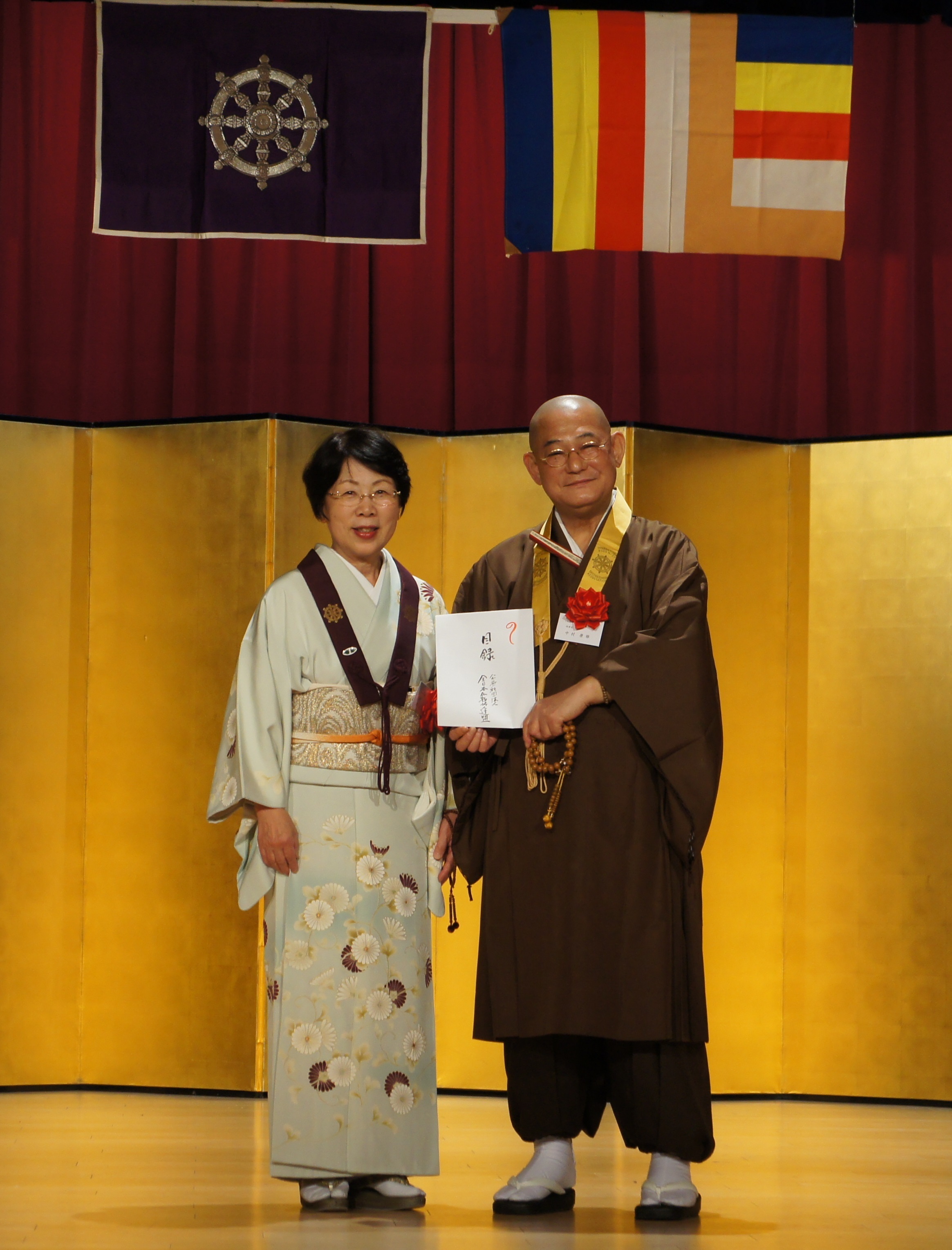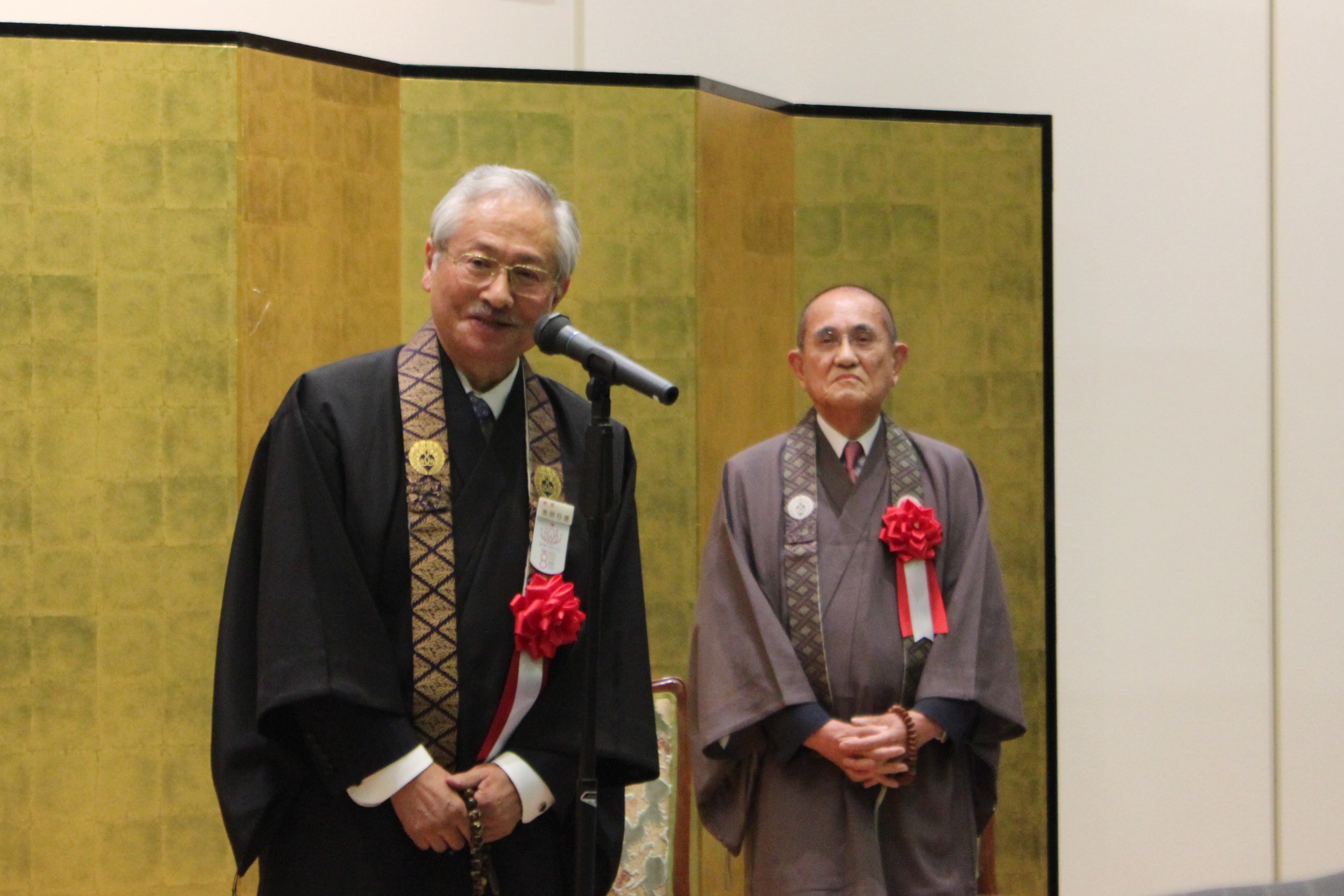 日本には数多くの宗派があるが、「佛教徒大会におきましてはみな、垣根を低くして同じ同志として歩んでいきたいと思っています。仏陀の教えのために」と、青年時代から超宗派的な活動に取り組んだ村山会長らしく挨拶した。続いて村山会長は、住職在任30年を迎えた35人を祝福し、代表者に表彰状と記念品を手渡した。