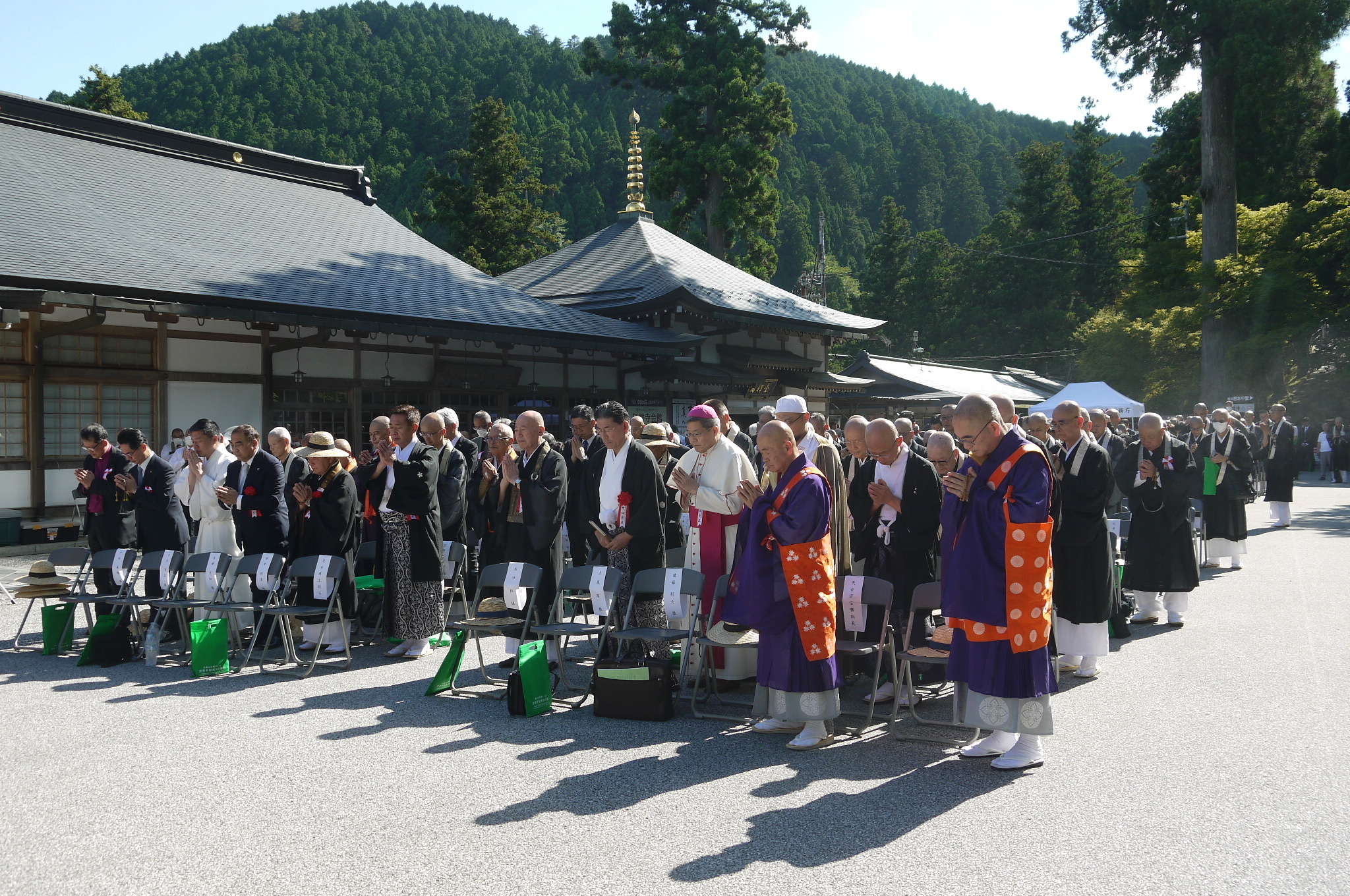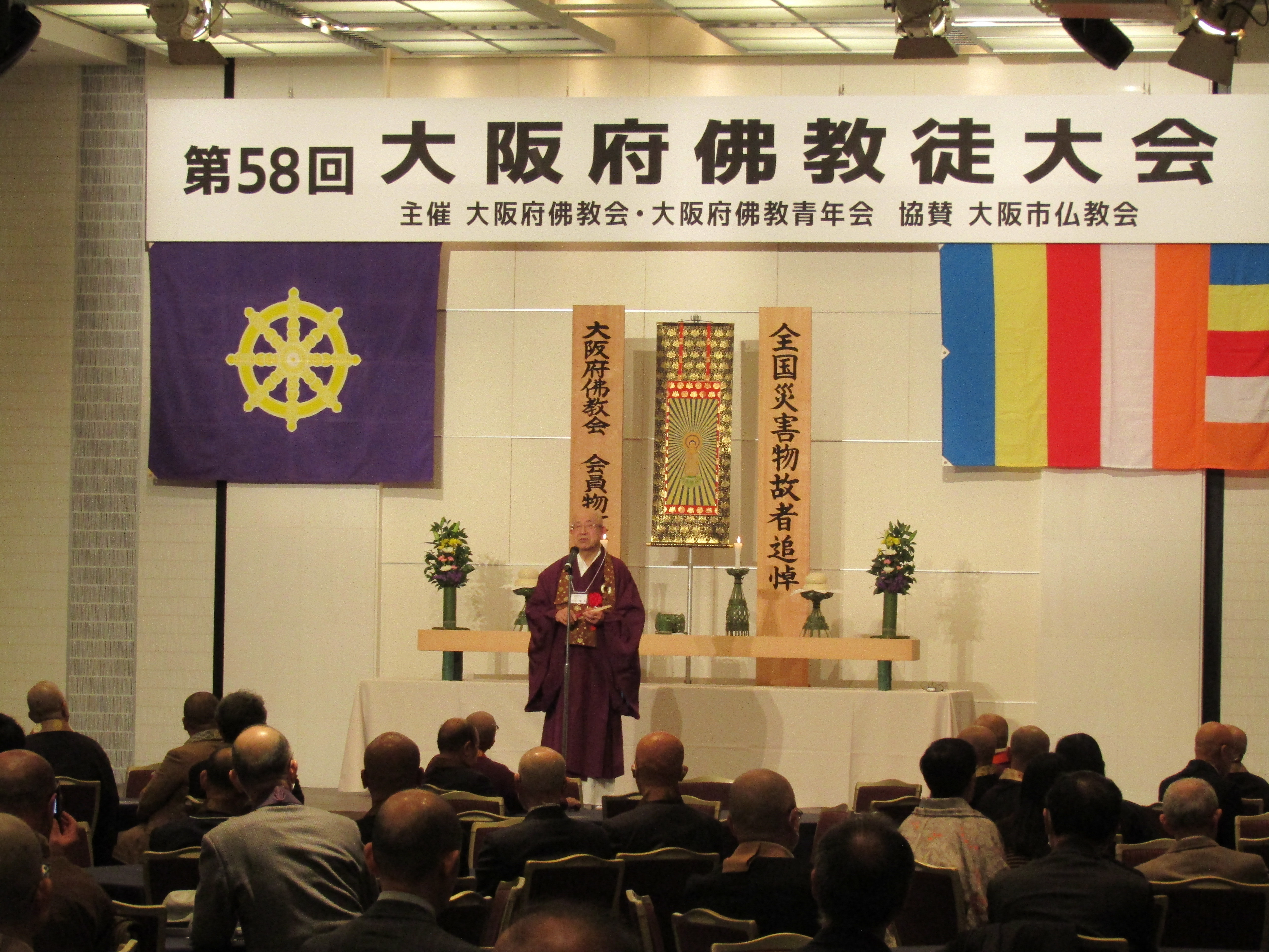 冒頭の全国災害物故者・会員物故者追悼法要は真宗高田派寺院が担当した。村山会長は開会にあたり、自坊の曹洞宗萩の寺東光院(豊中市)の萩の木は毎年、花の終わりの勤労感謝の日に株元まで刈り取るが、翌年にはまた美しく咲く「いのち」の流れがあると語り、さらに「東南アジアの仏教徒に接すると、向こうの人は無条件で輪廻転生を信じている」とし、こうした考えは釈尊の根本の教えであると指摘。