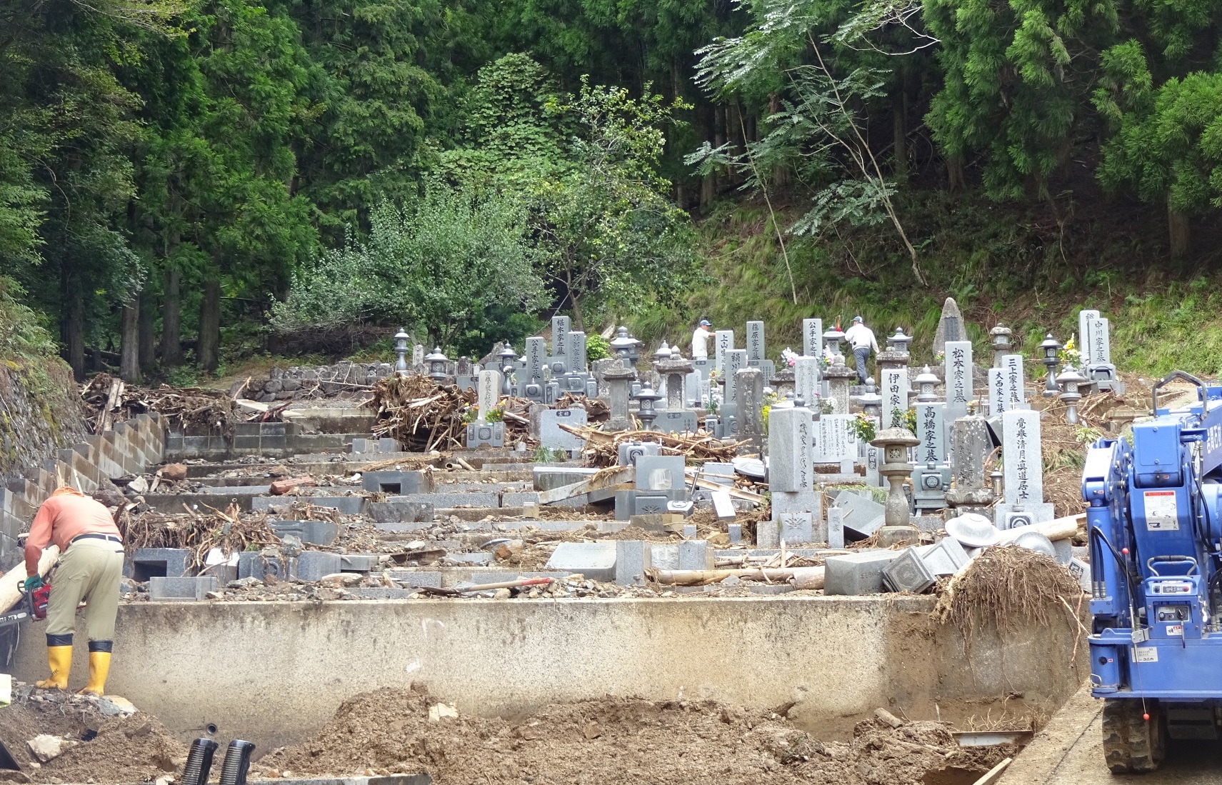 玉春勇樹住職(40)が危険を察知して本尊の阿弥陀如来像を運び出したところ、地震のような揺れがあり、壁を突き破って水が流れてきたという。直後、消防団のすすめで玉春住職や家族は避難し、けがはなかった。庫裏と本堂の連結部も圧力で歪みが生じている。納骨堂には被害はなかったという。門徒宅でけが人が出た情報は入っていないが、家屋の床上・床下浸水や農地が土砂流入などで被害を受けているという。