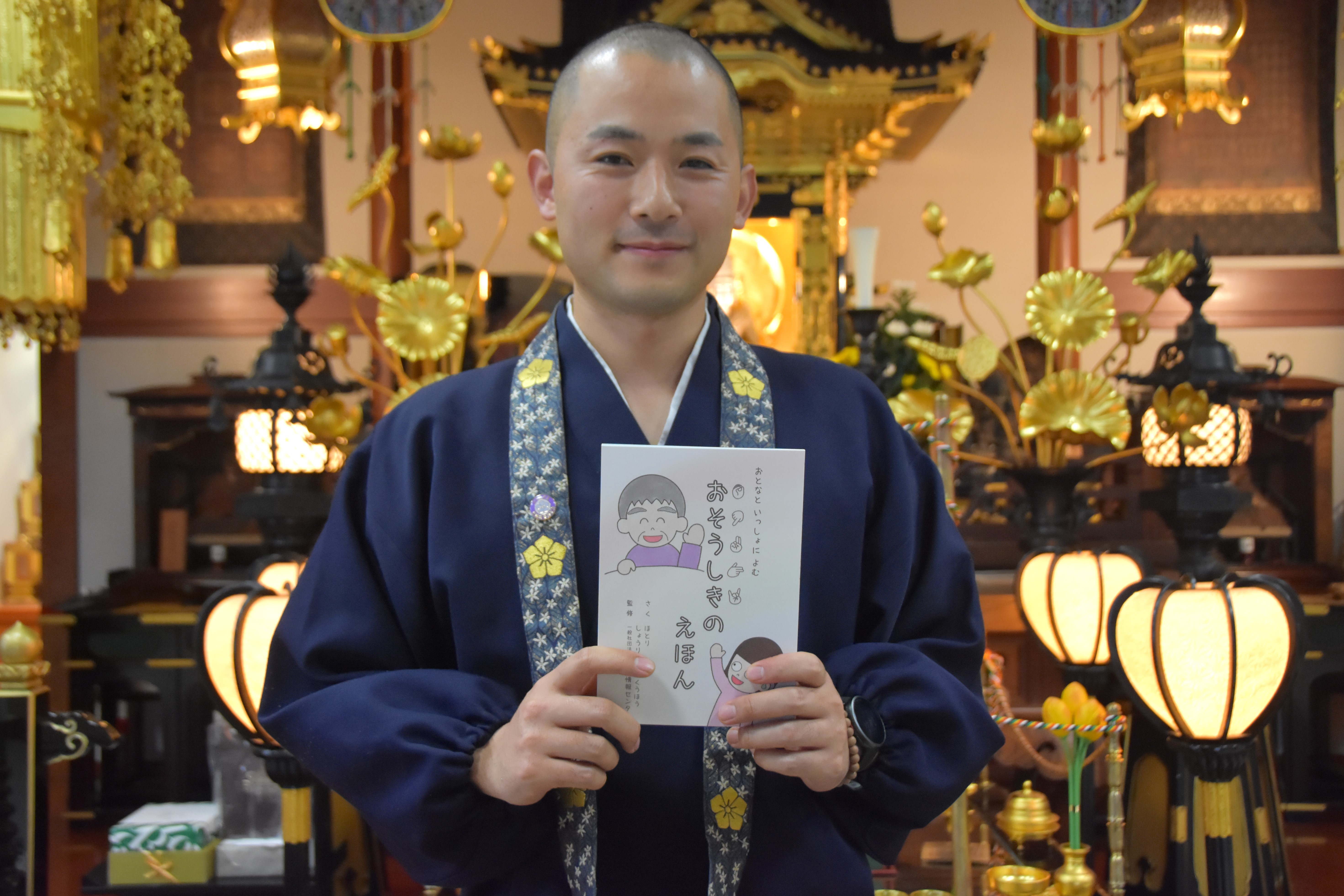 絵本を手にする作者の一人、青龍寺さん 耳が聞こえにくい子どもにも葬儀の意味を知ってほしいと、当事者の親である僧侶・青龍寺空芳さん(33)が、寺院出身の手話通訳士・石川阿(ほとり)さん(34)とともに絵本『おとなといっしょによむ おそうしきのえほん』をつくった。青龍寺さんは「誰もが大切な人とお別れできる権利があります。葬儀でおいてけぼりになる人がいなくなるよう願っています」と話す。
