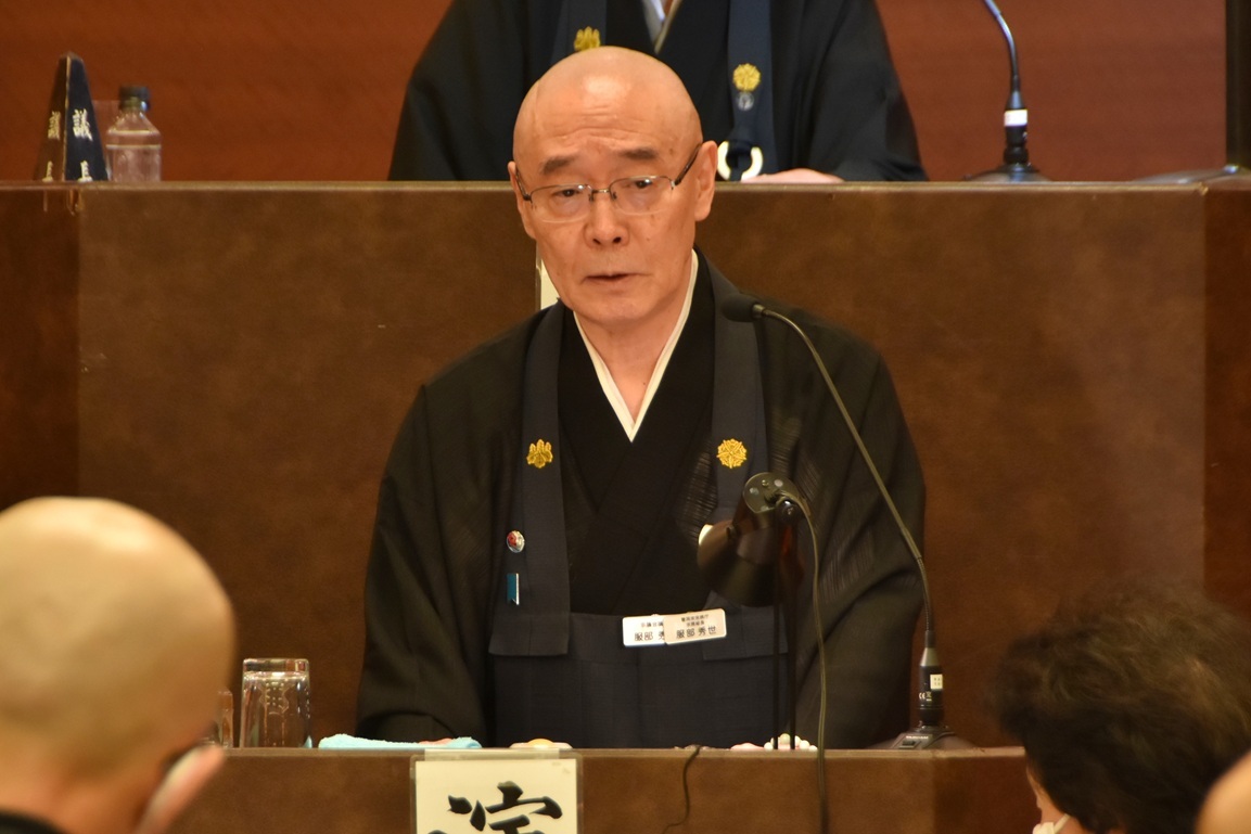 演説する服部総長 曹洞宗の第147回通常宗議会(小林孝道議長)が6月23~27の5日間、東京・芝の檀信徒会館で開かれた。東京グランドホテルの跡地再開発で、服部秀世宗務総長はプロジェクトマネジメントを担当する企業インデックスコンサルティング(東京・虎ノ門)と業務委託契約を結んだと発表した。契約の費用として5千万円の補正予算を組んだ。