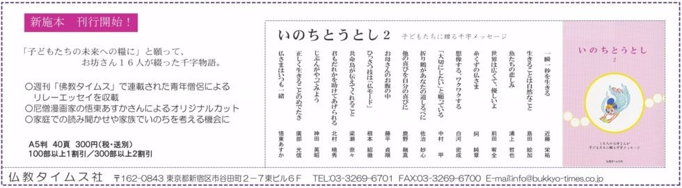 佛教タイムス紙上で2012年から2013年まで好評連載された、若手僧侶がいのちの大切さを伝えるリレーエッセイ「いのちとうとし2」が本にまとまりました。