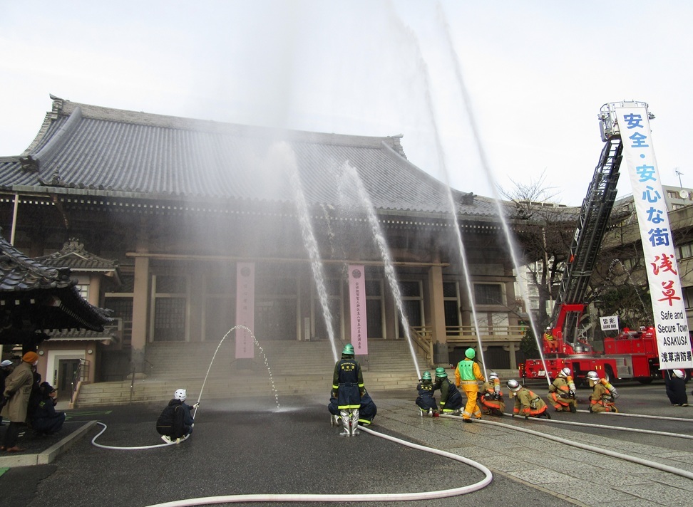 文化財防火デーにあたる1月26日、東京都台東区の浄土真宗東本願寺派本山東本願寺で消防演習が行われた。今年は初めて浅草仏教会も参加して、一斉放水を体験した。(2月12日号)