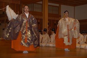 世界の邪気を祓い一切を清める大潔斎神事では伝統衣装を着た信徒の女子高校生2人がみやびな「潔斎の舞」を舞ってみせた。