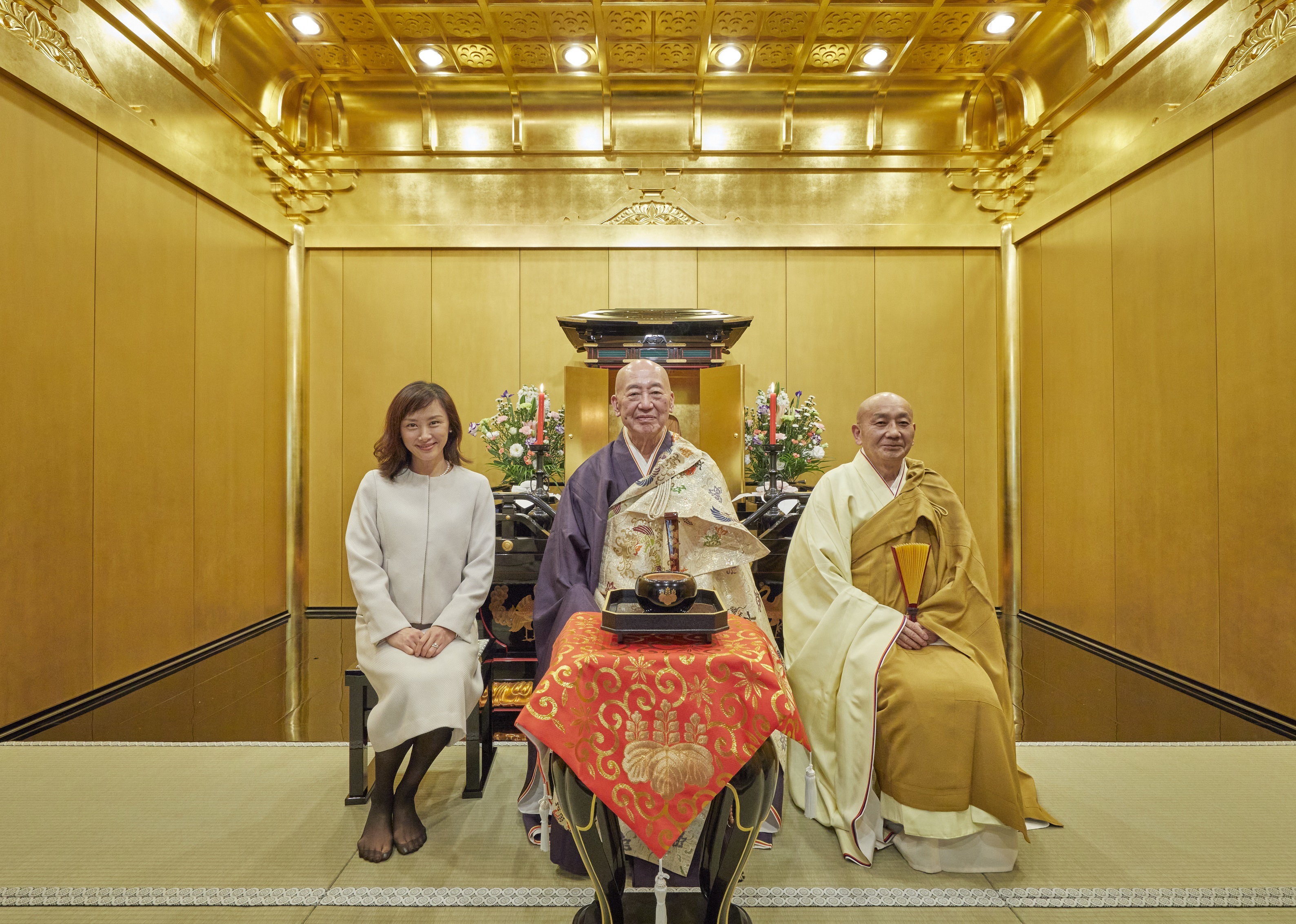 落成した翠雲堂「黄金の間」で石附貫首(中央)と渡辺監院、山口もえさん 寺院建築・寺院荘厳具・仏壇の専門店、株式会社翠雲堂(本社:千葉県松戸市/山口豊社長)は12月10日、本社屋に移築した「黄金の間」で、曹洞宗大本山總持寺(神奈川県横浜市)の石附周行貫首を大導師に迎え、本尊釈迦如来開眼御祈祷と新装した本社の落成式を挙行した。
