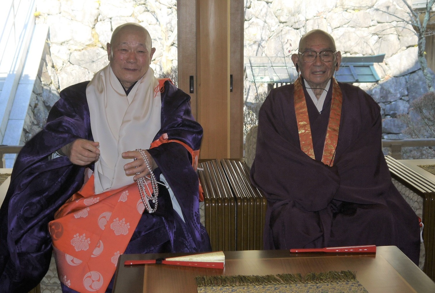 金剛峯寺座主応接で笑顔を見せる長谷部座主(左)と大樹座主天台宗総本山比叡山延暦寺(滋賀県大津市)の大樹孝啓天台座主(98)が12月9日、和歌山県高野町の高野山真言宗総本山金剛峯寺を訪問し、長谷部真道金剛峯寺座主(84)と歓談した。大樹座主はその後、入定信仰と高野浄土信仰の聖地・奥之院に参拝。天台宗の開祖伝教大師と共に唐に渡って平安新仏教を開いた弘法大師の御廟宝前に立ち、静かに祈りを捧げた。天台座主の高野山訪問は3回目で、平成27年5月の高野山開創1200年記念大法会での天台宗法要以来7年ぶり。
