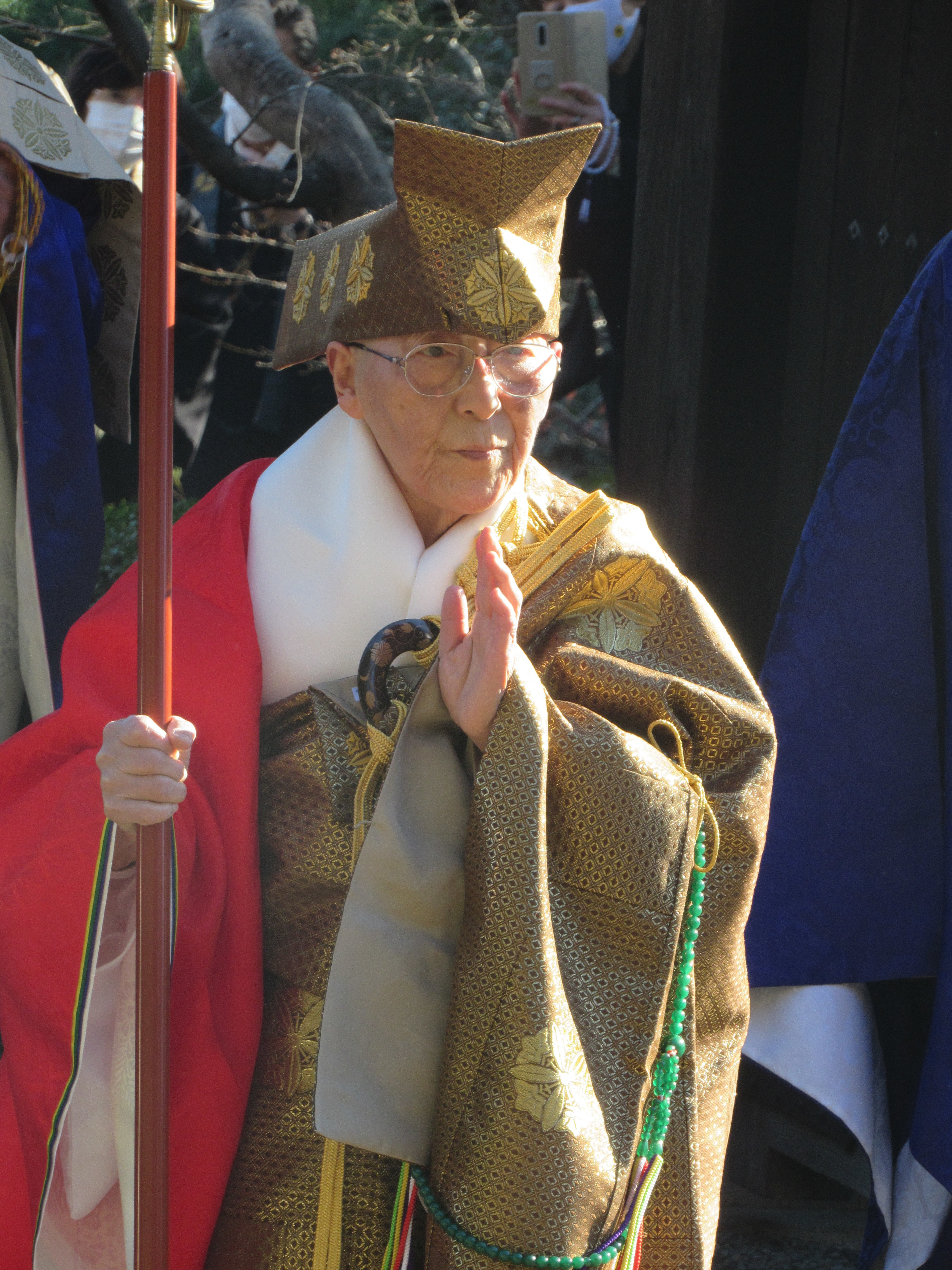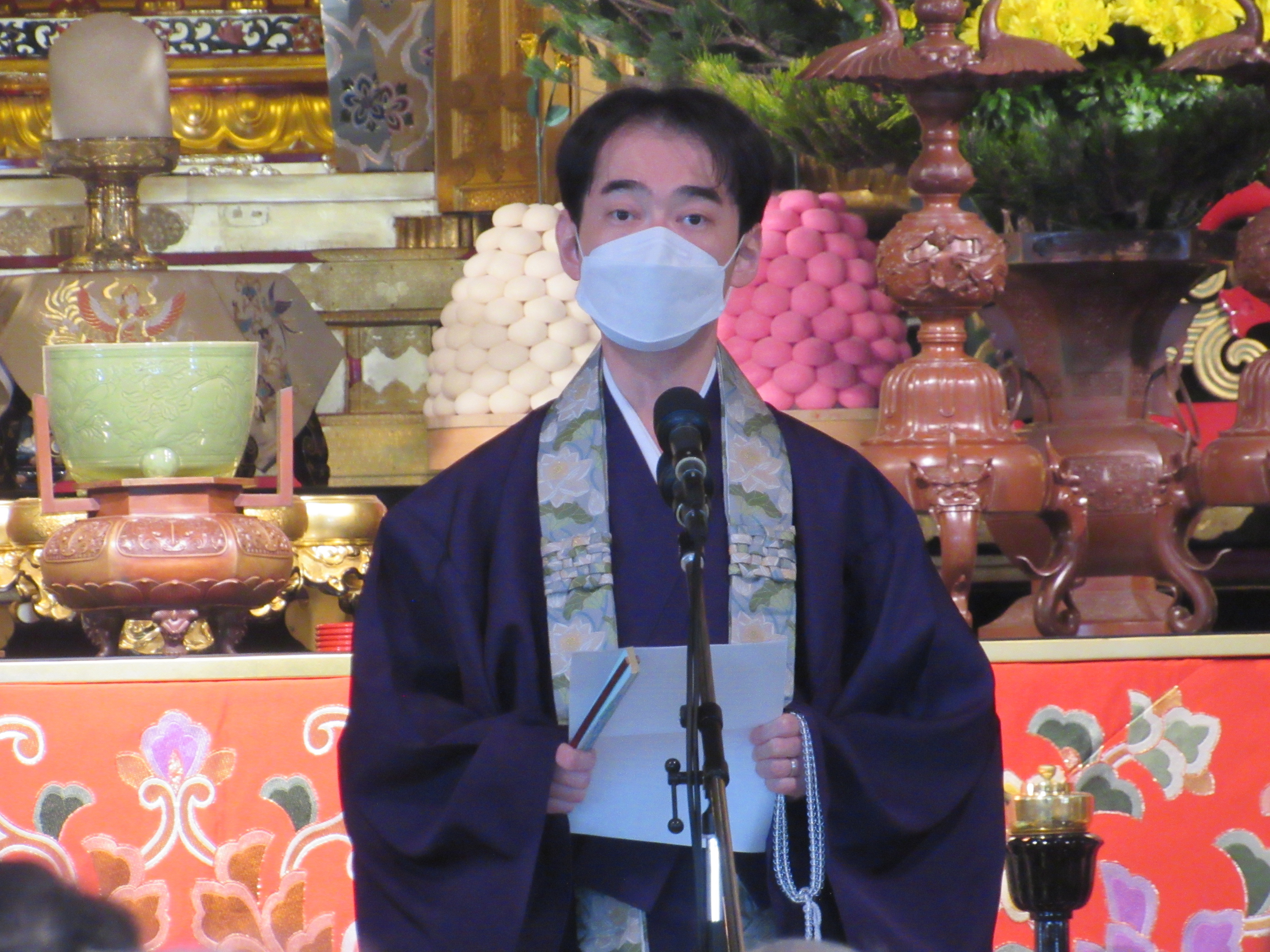 晋山式に臨む沢田教英管長(12月15日) 私も戦争を体験しましたが、戦争(ロシア軍によるウクライナ侵攻)は早く終わって欲しい。戦争で得することは一つもないのですから。法然上人は、9歳の時にお父さま(漆間時国)が武者に殺害され、今際の言葉で敵討ちはしてくれるな、それよりは万人が救われる教えを勉強して欲しいと遺言され、出家された。お釈迦さまの言葉に「怨まれて怨み晴らすな怨みなば また怨まれて怨み果てなし」があります。どこかで怨みの心を捨てなければなりません。