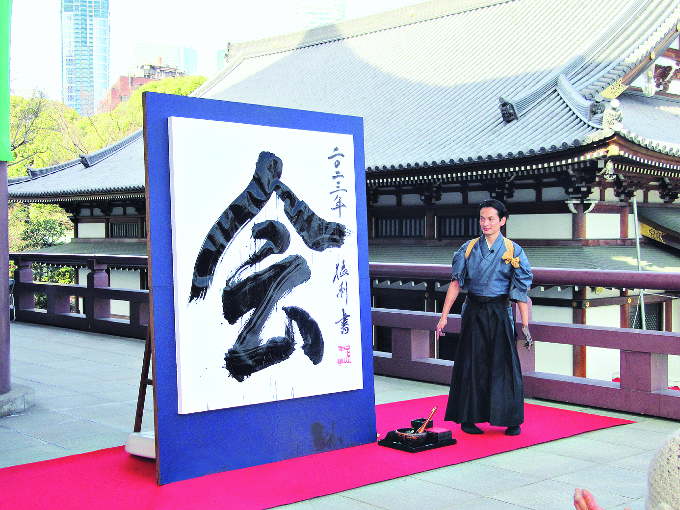 増上寺大殿前に置かれた大判の半紙に正対した鈴木氏が、集中力を高めて「会」の一字を揮毫すると会場から拍手が起こった。昨年末にインターネットで募集した願いの一字の中から選ばれた「会」の字は、コロナ禍の行動制限で出会う機会が極端に少なくなったが、「今年こそ会えなかった人に会う」という願いを込めて選定された。「会」という文字は、修正会・涅槃会・灌仏会などの宗教的な集まりに使われるほか、「会得」「会通」などに使われる奥深い意味を持つ漢字でもある。
