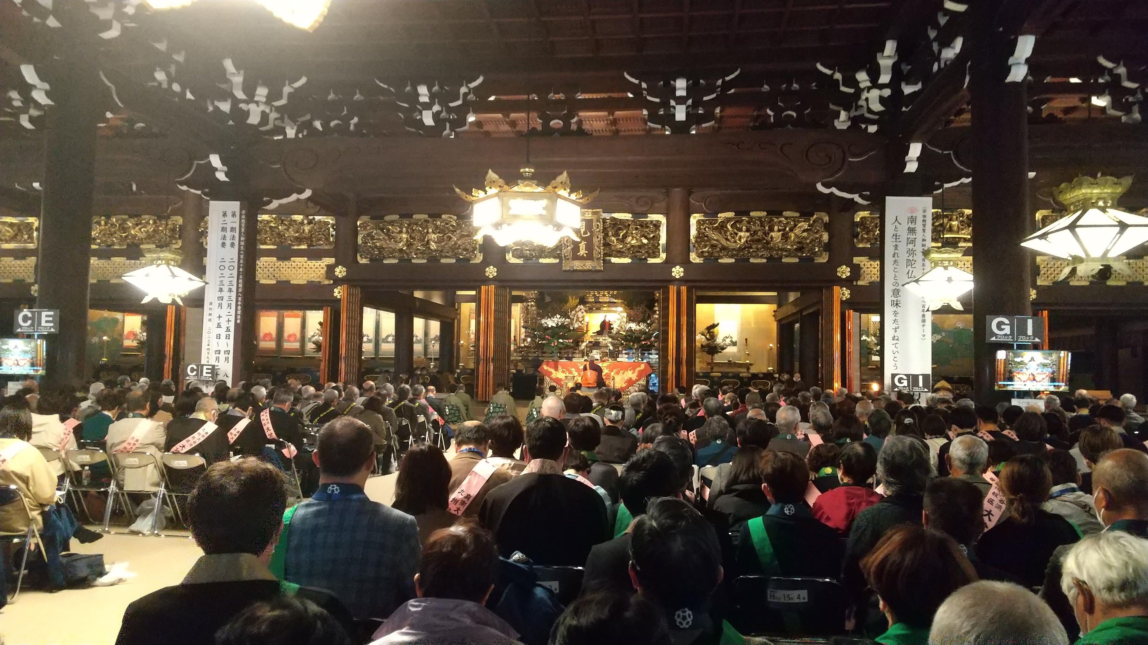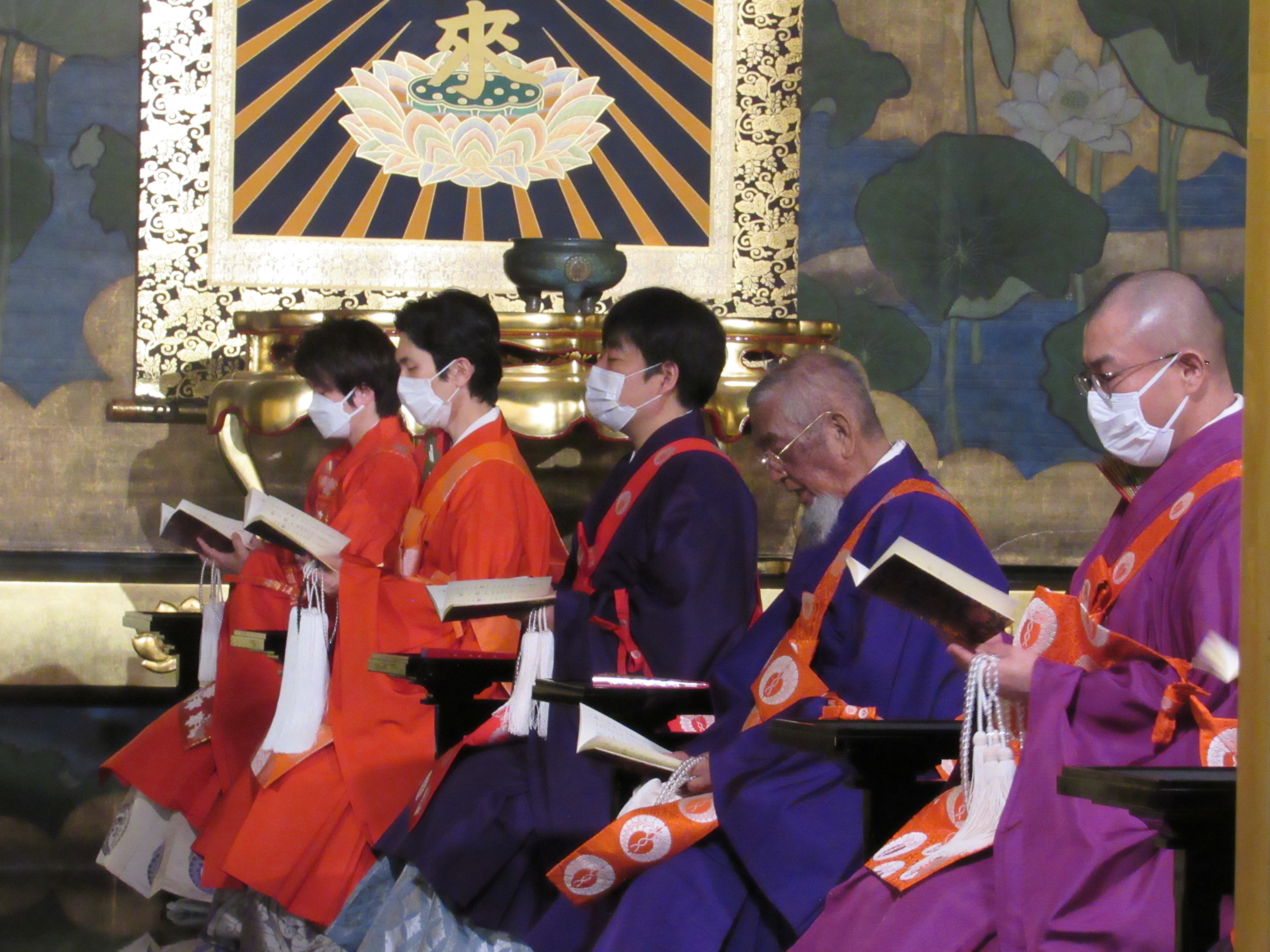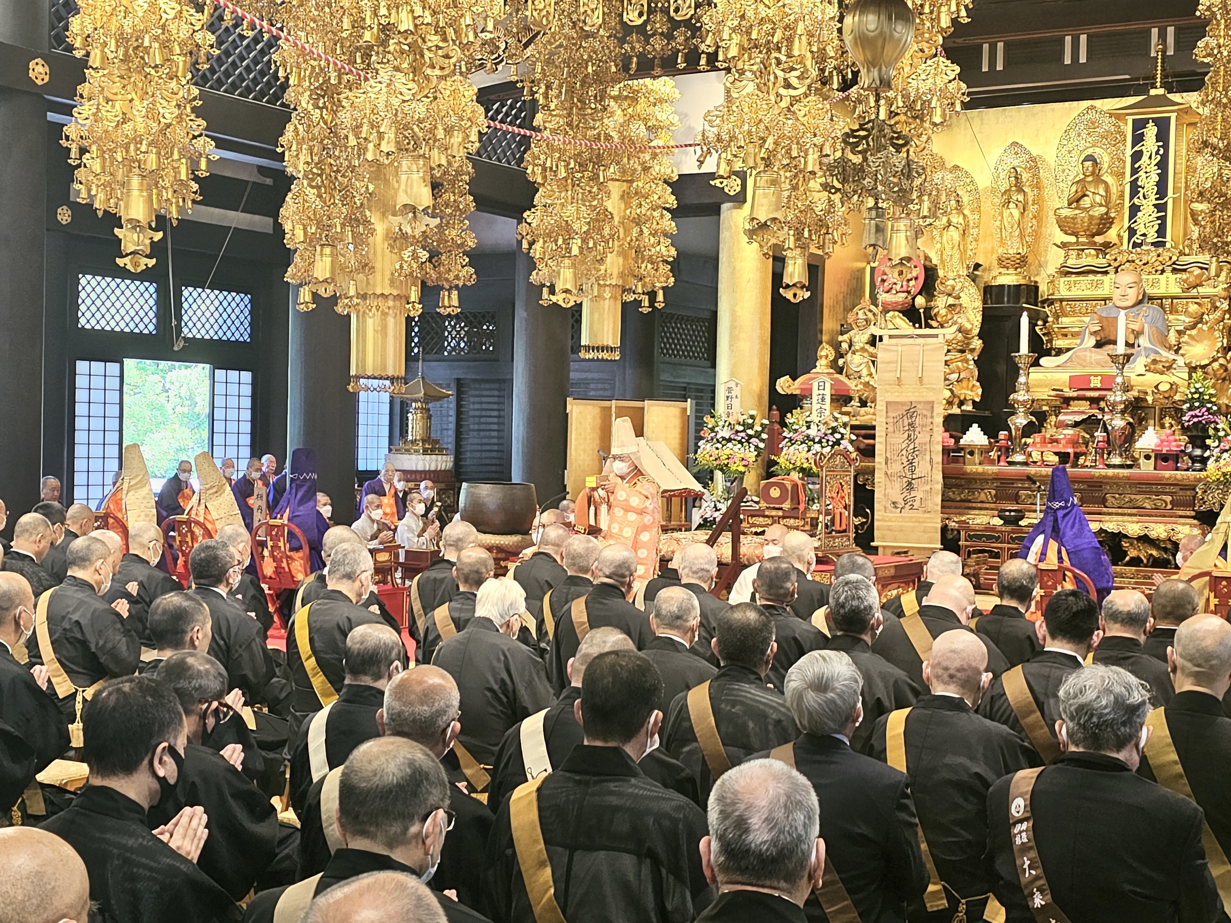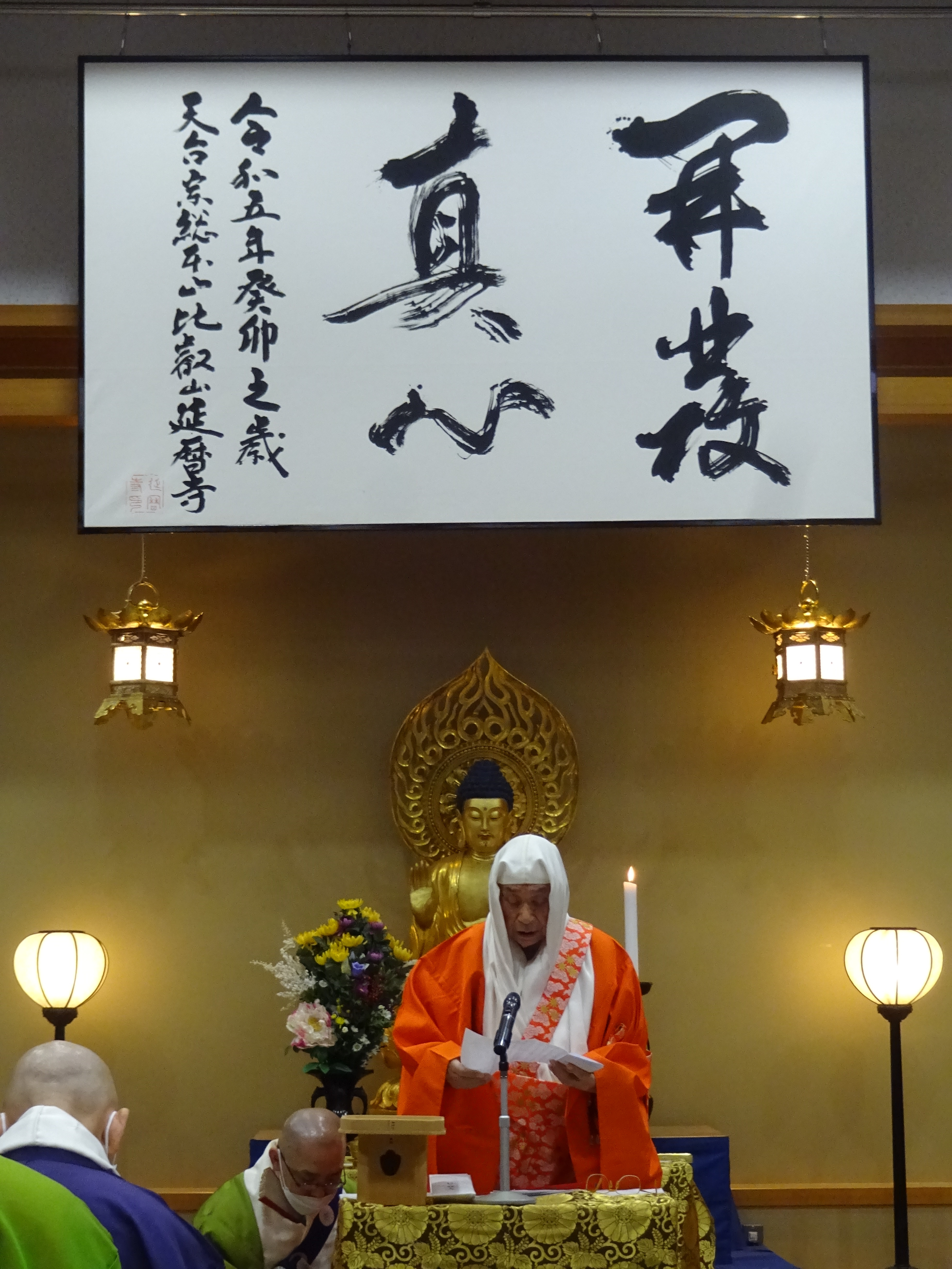 開会の法楽は大樹孝啓天台座主が導師を務めた。大樹座主は「お陰様で数え百歳を迎えることができましたのは誠にありがたいことで、神仏、祖師先徳のご加護はもとより宗徒の皆さまのご助力によるもの」と感謝。未だ終わらぬロシア・ウクライナ戦争や、昨年8月の比叡山宗教サミットで激しい雷雨が襲ったことに象徴される地球環境の激変に心を痛め、「最澄様の、努めよ、努めよとの御遺誡を体し、地球上のあらゆる命がいきいきと幸せに暮らすことができるよう共に祈りを捧げてまいりましょう」と語った。