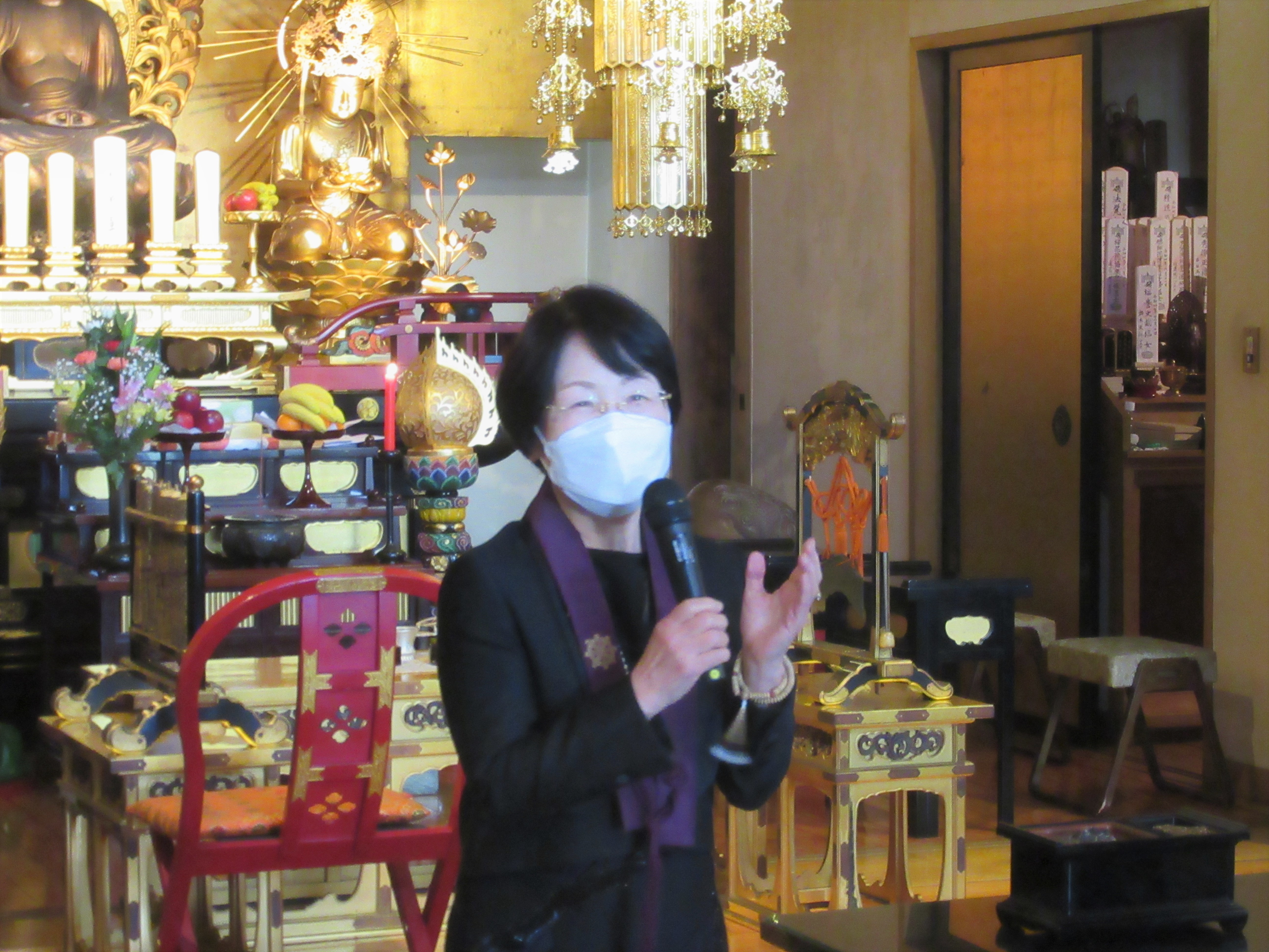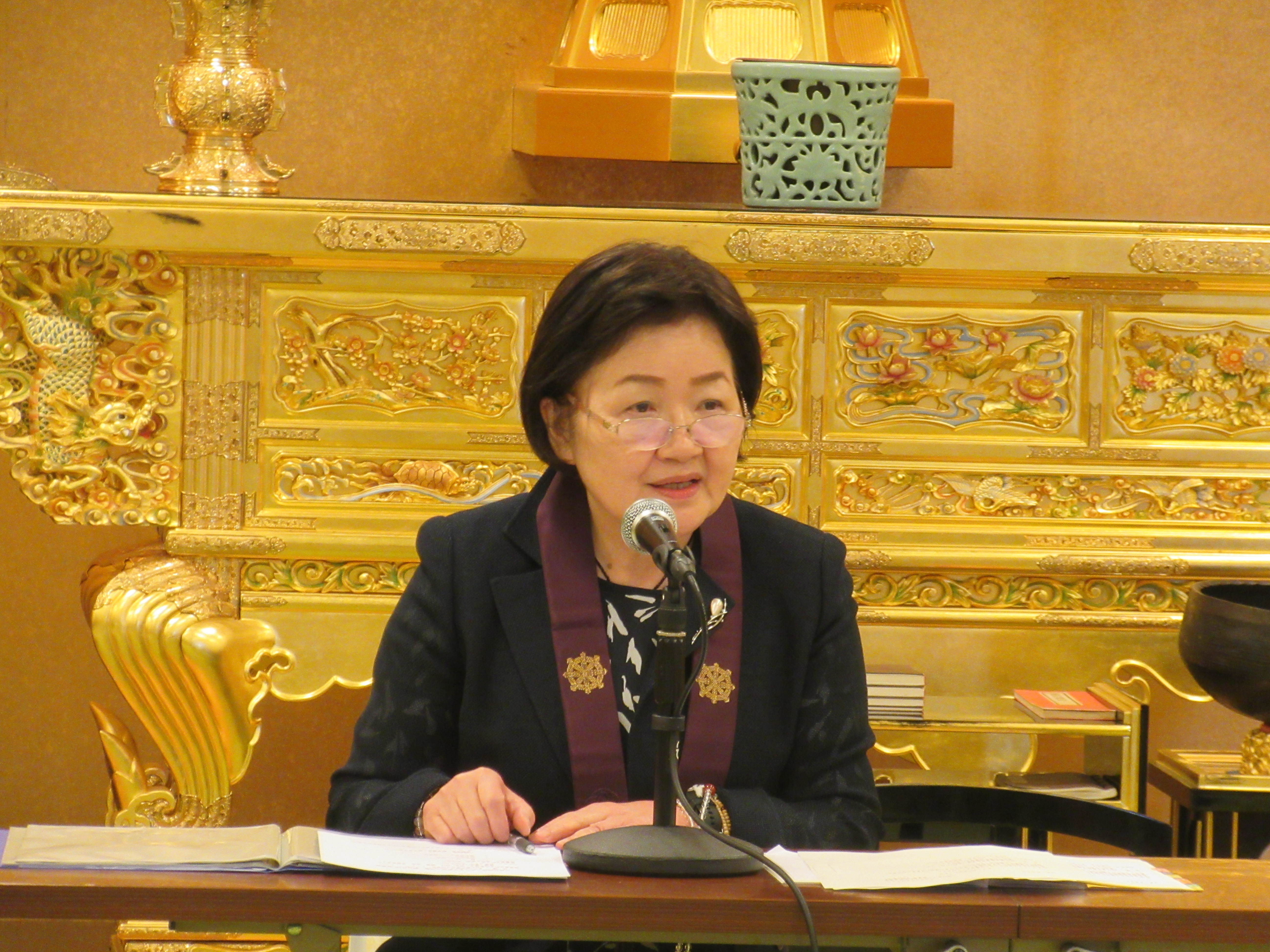 再任を受けて挨拶する花岡理事長 (公財)全日本仏教婦人連盟(全仏婦)は14日、東京都台東区の浄土真宗東本願寺派本山東本願寺で2022年度総会・理事会を開いた。役員改選があり花岡眞理子理事長が再任された。