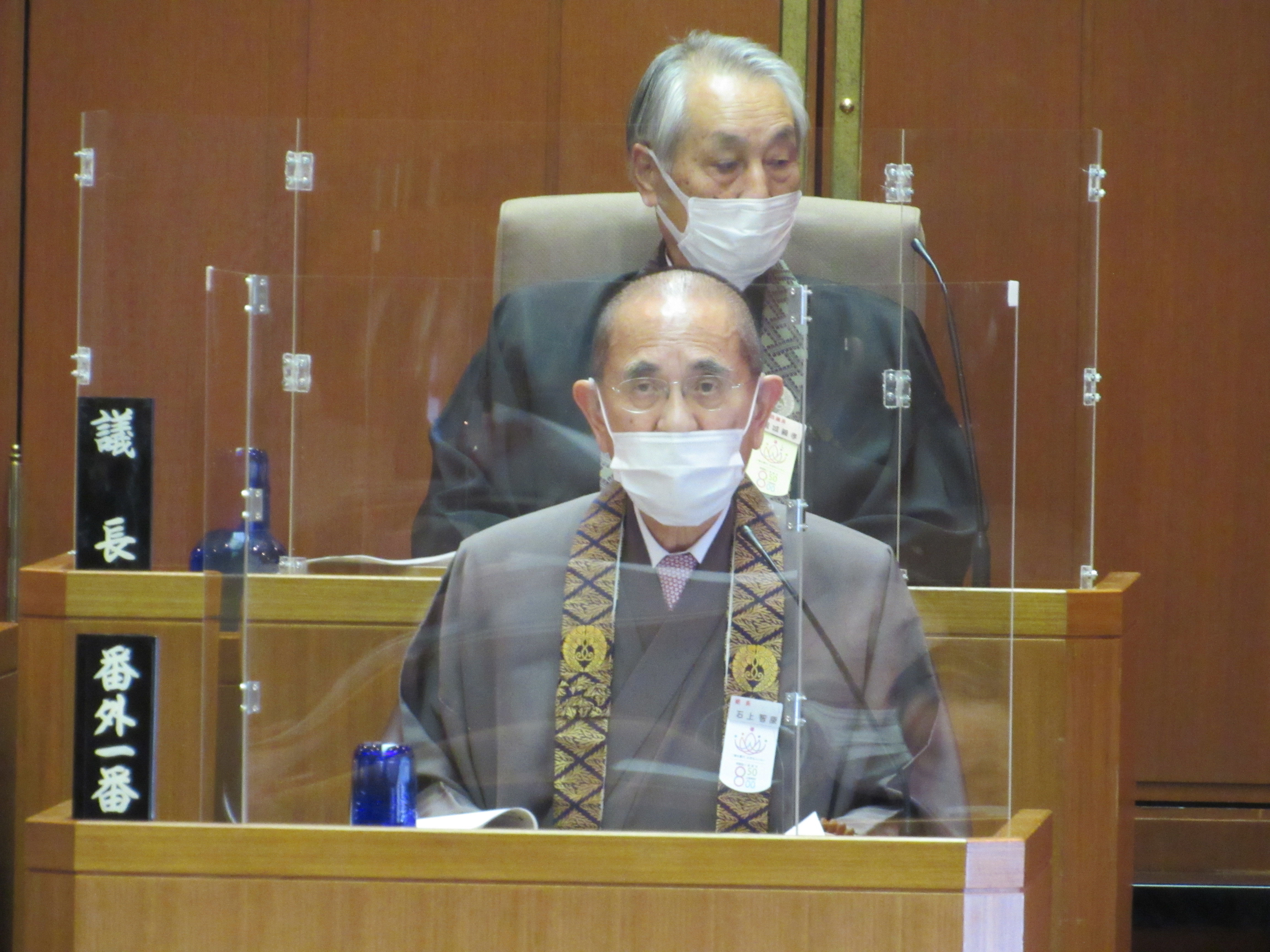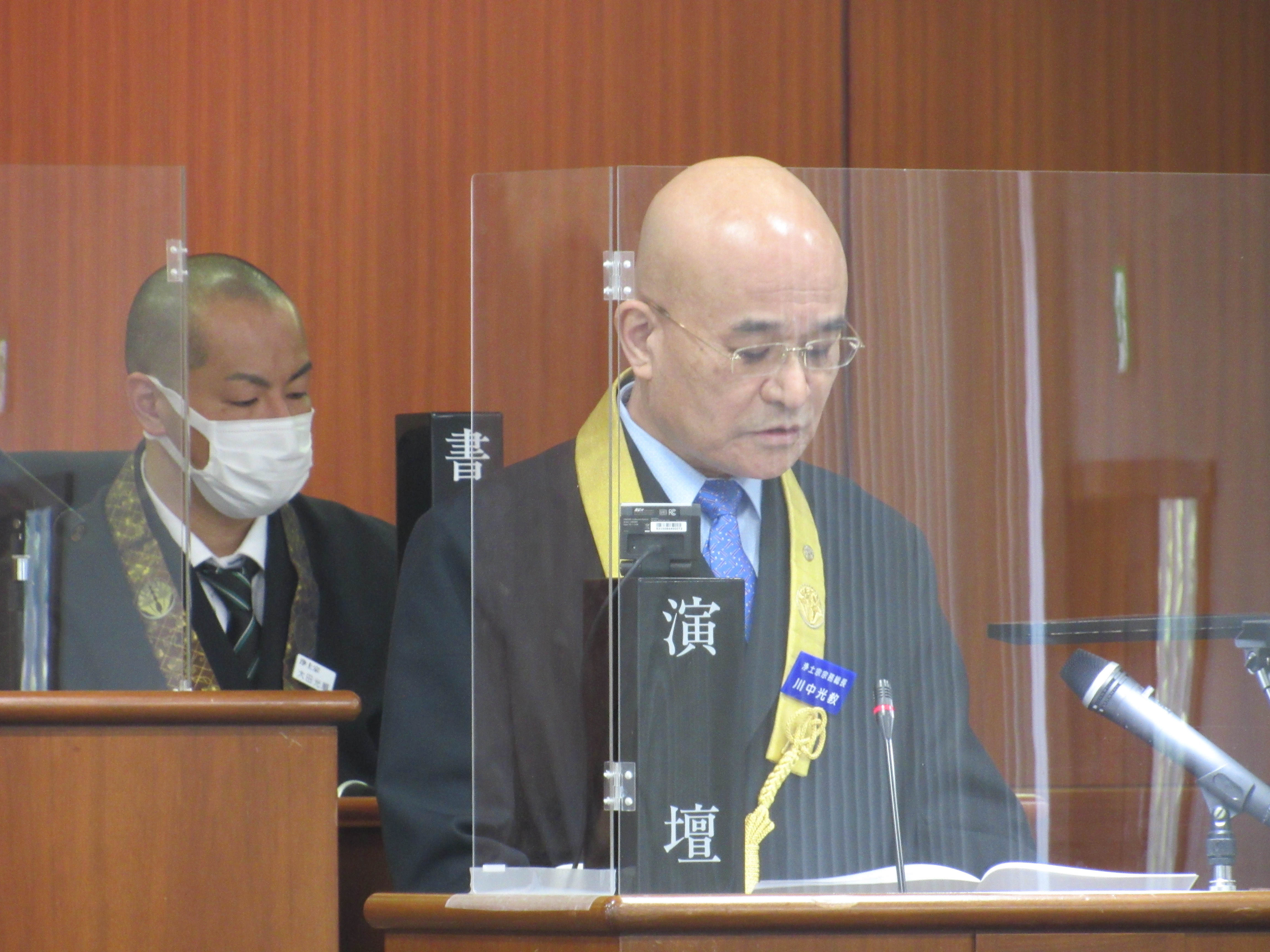 尾池文章宗会議長が瀬川門跡の慶讃文を奉読。宗祖への敬慕の念から出家して自ら真言行者となった宇多法皇によって、弘法大師号の追贈がなされた故事を語った。
