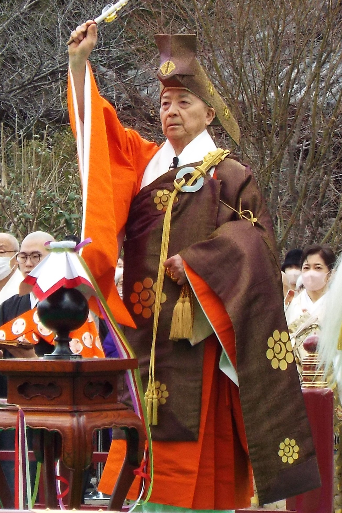 数え年で百歳となったことを神仏に感謝する大樹座主 天台宗総本山比叡山延暦寺の「年賀式」が8日、滋賀県大津市の延暦寺会館で行われた。今年の「比叡山から発信する言葉」は「開発真心」。真の心(まごころ)を込めれば必ず相手にも通じるという思いを込めたもので、互いの仏性を開き発こすことを誓った。仏教界・政財界などから約400人が参加した。