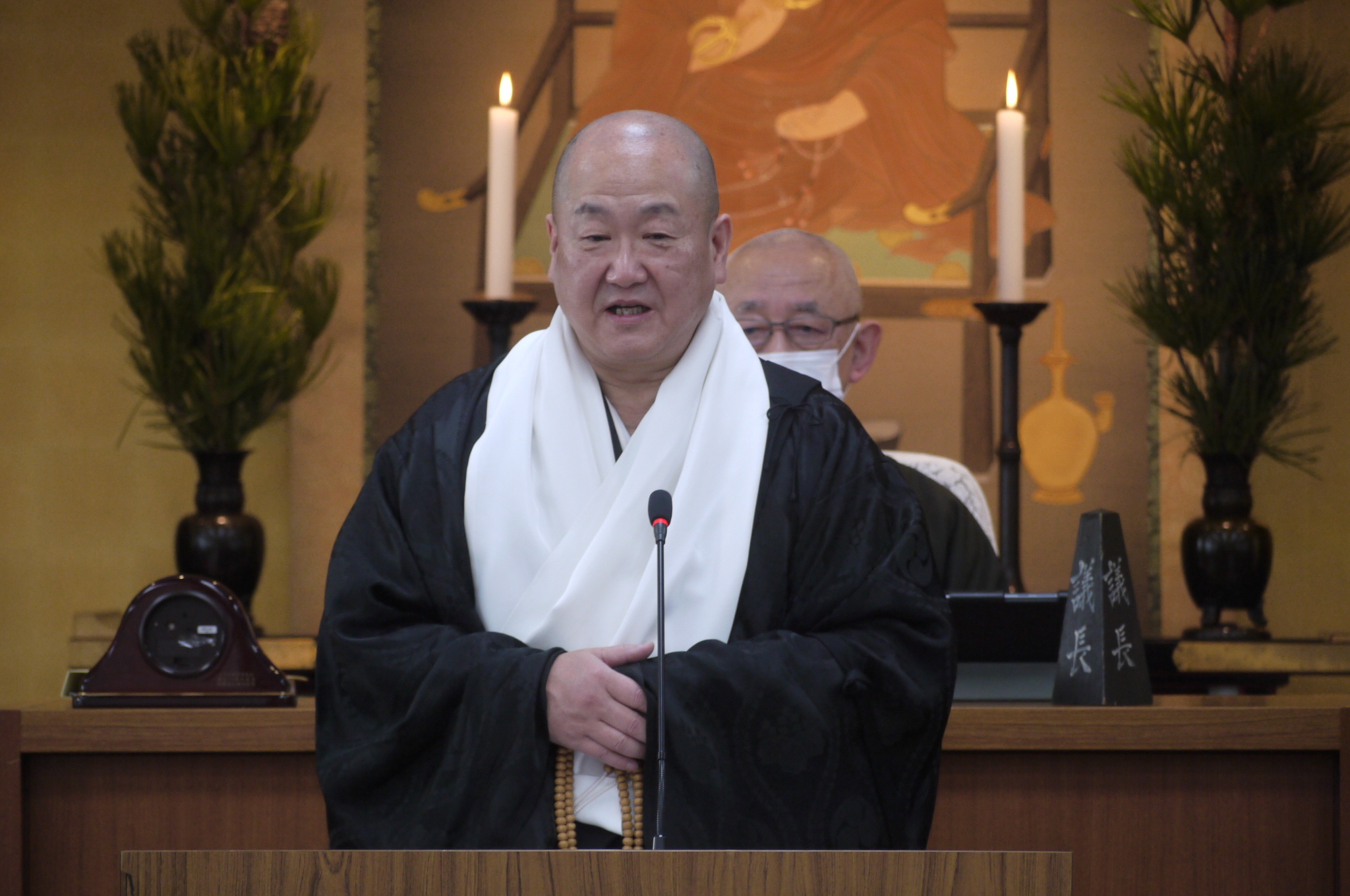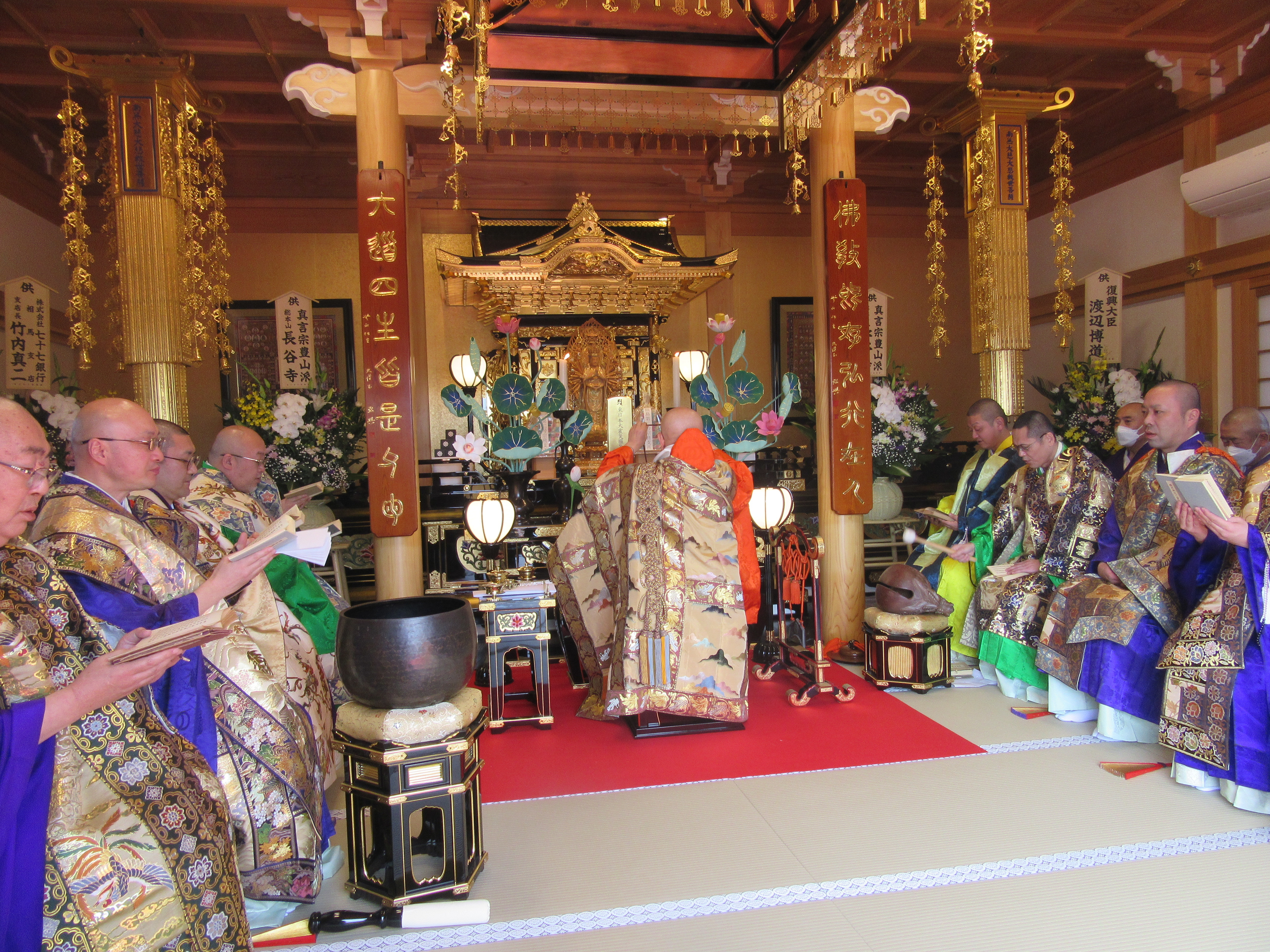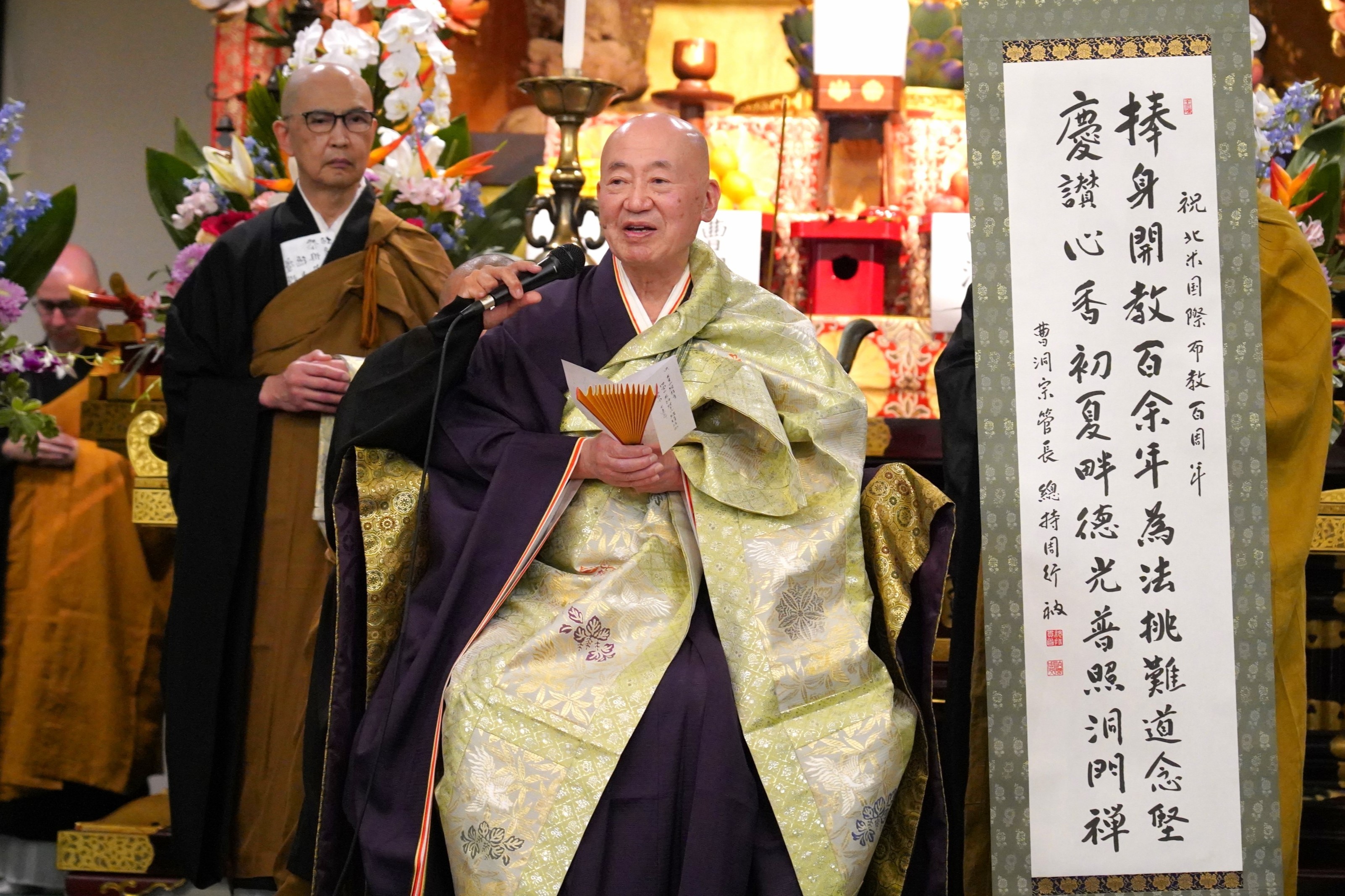 石附管長は法要で唱えた法語「捧身開教百余年 為法挑難道念堅 慶讃心香初夏畔 徳光普照洞門禅」の墨書を掲げて垂示。100年の節目にあたり、長く心の中で焚き続けてきた香をもって慶讃の念を表したことなど法語の趣意を伝えた上で、「只管打座、即心是仏という教えの核心をいただけるよう相勤めてまいりたい」と述べ、来年迎える瑩山禅師700回大遠忌の際にも香を手向けてほしいと話した。