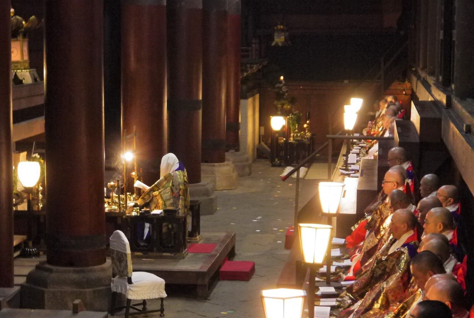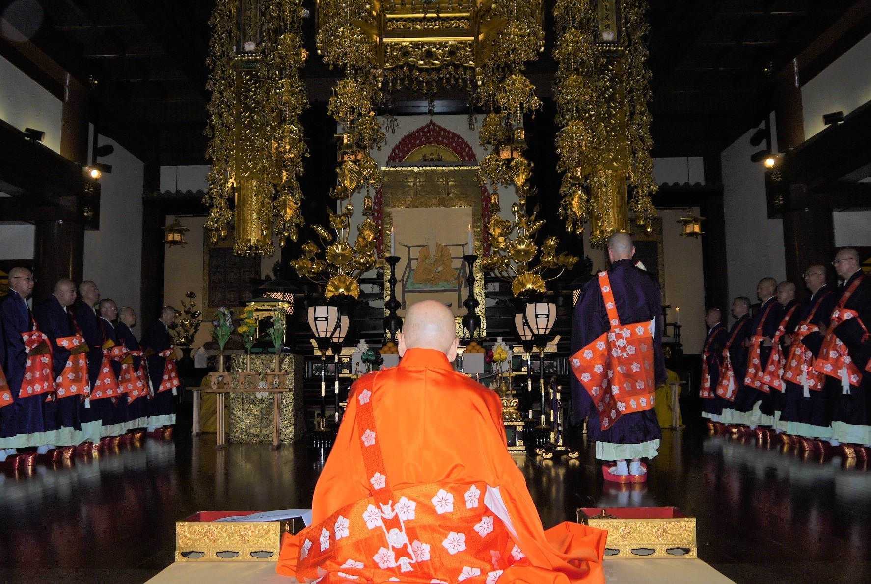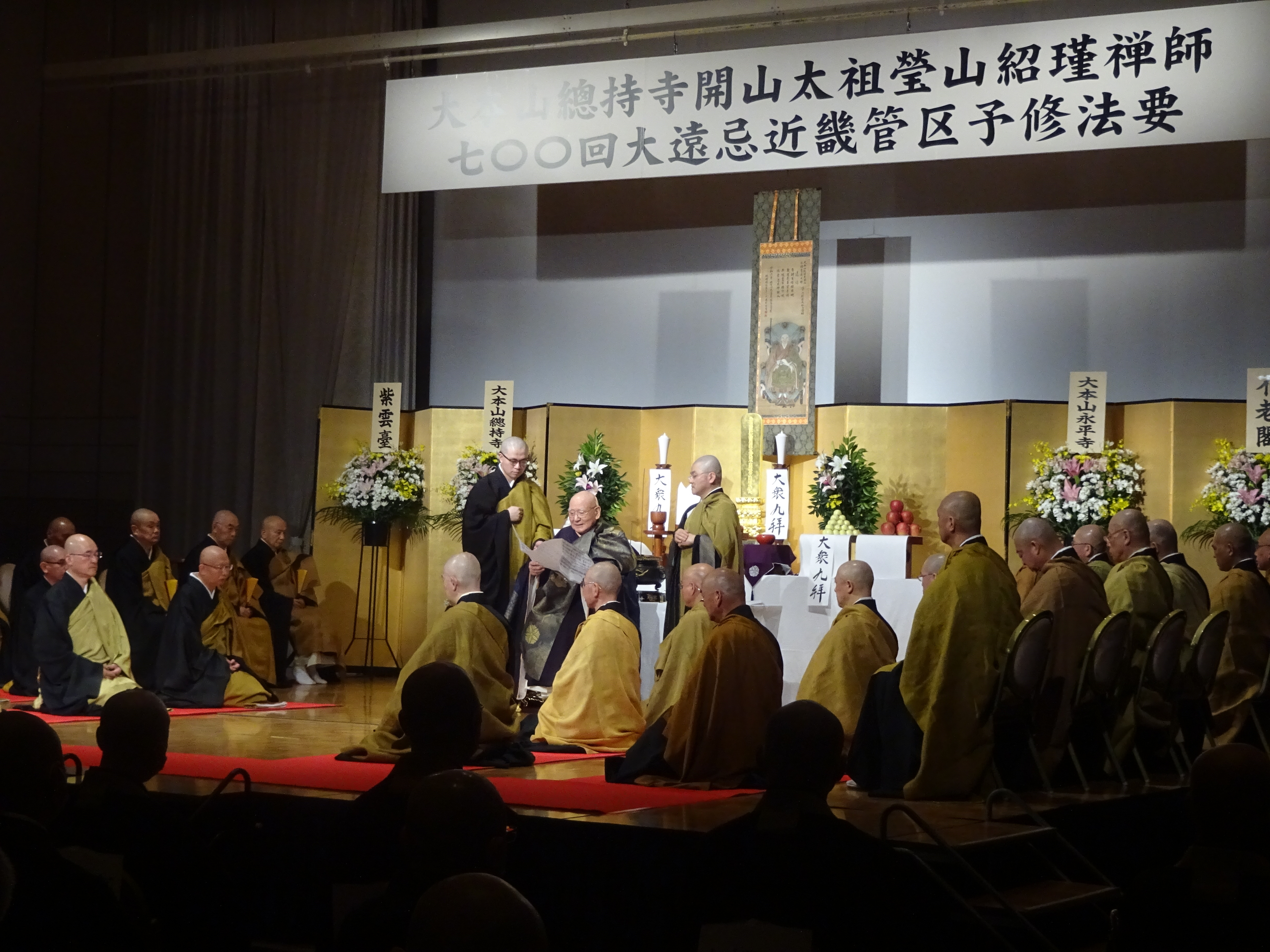 27日には来年に向け国内外で営まれている大遠忌予修法要を執行。18回の礼拝で敬意を示す格式高い法式「献供出班」の導師を務めた服部秀世宗務総長は法要後、「瑩山禅師の大いなる足音を感じていただけたと思う」と挨拶。「誰もが仏道を成就する器量を備えている。一日一日が仏道を行ずる好機。先達より伝えられた正法が日々の生き方となり、仏道として人生の中に結実するよう心から祈念する」と語った。