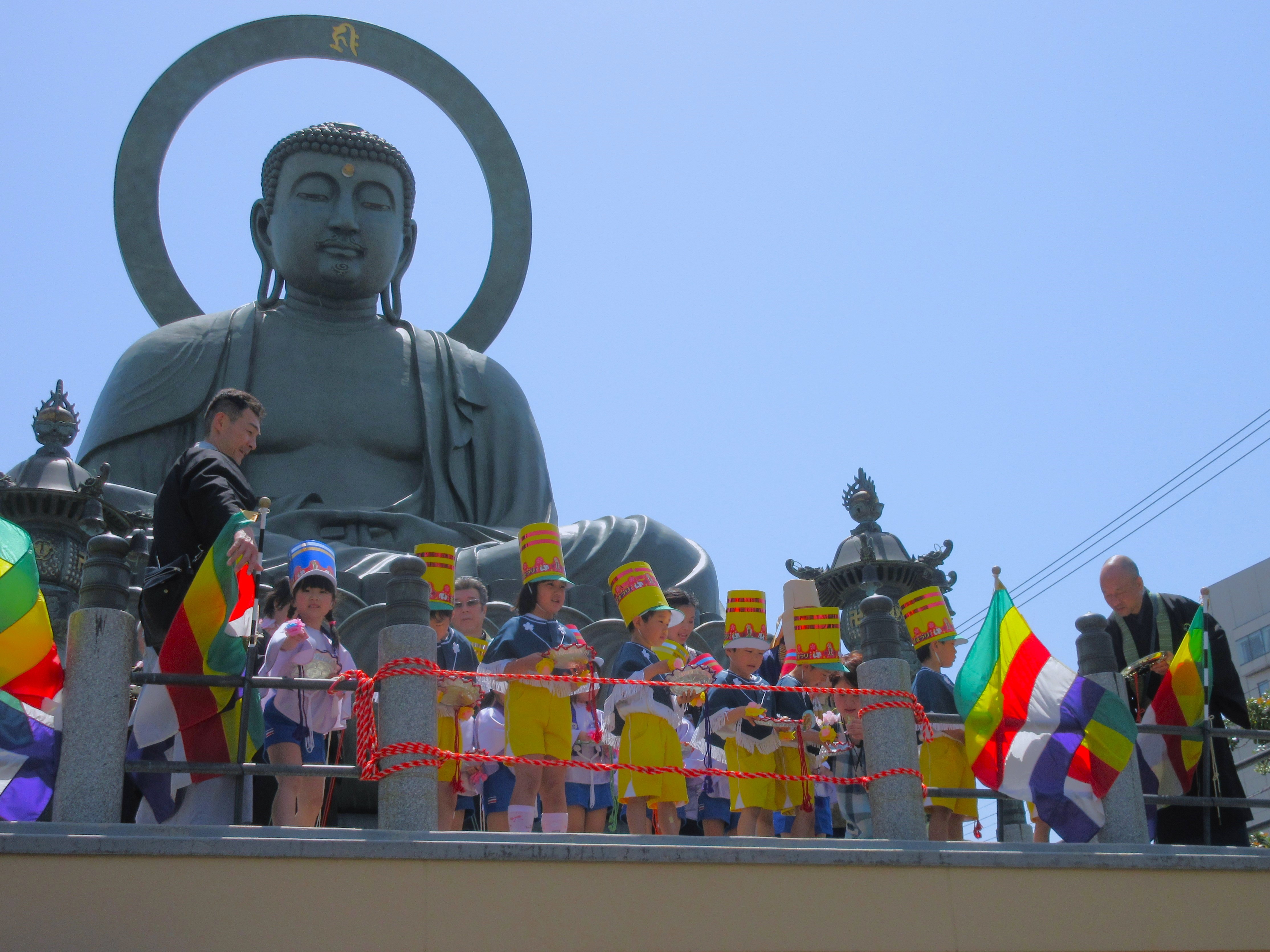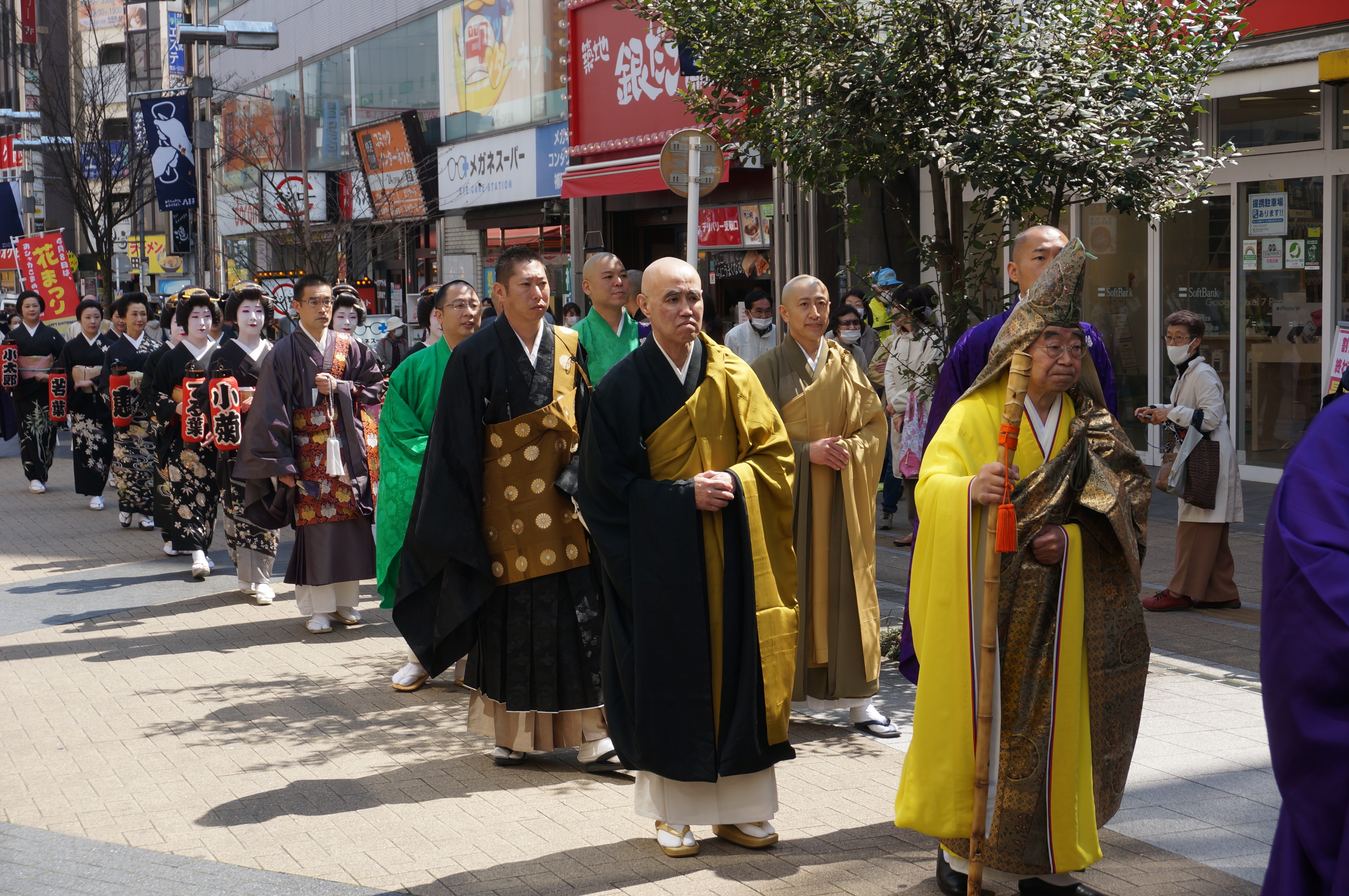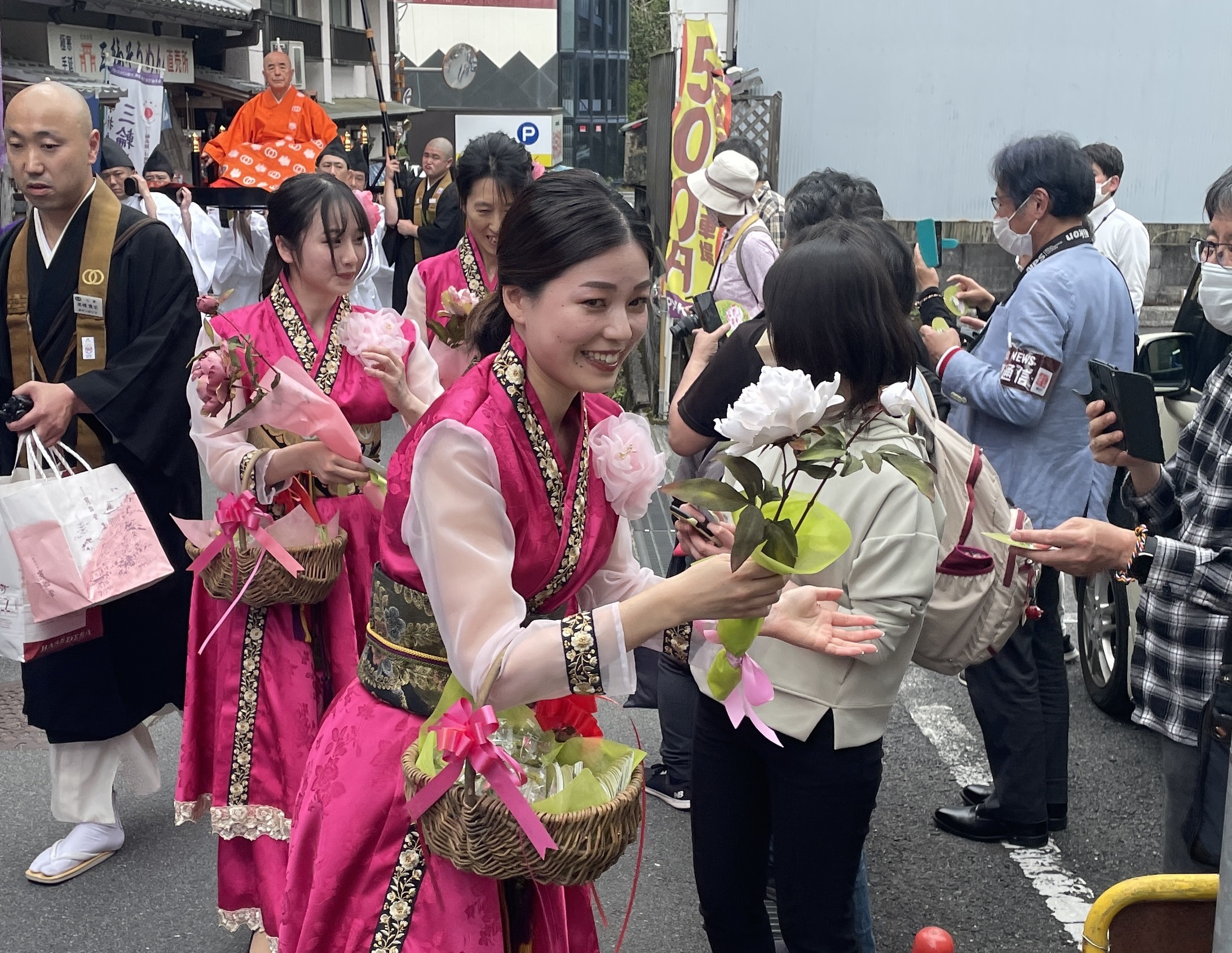 同会は弘法大師の生誕を祝う「夕べ」を定期的に行い、節目となる今回はコロナ禍を経て4年ぶりの開催となった。境内には長谷観音大画軸がクレーンで上げられ、午前中から多くの参拝者で賑わった。