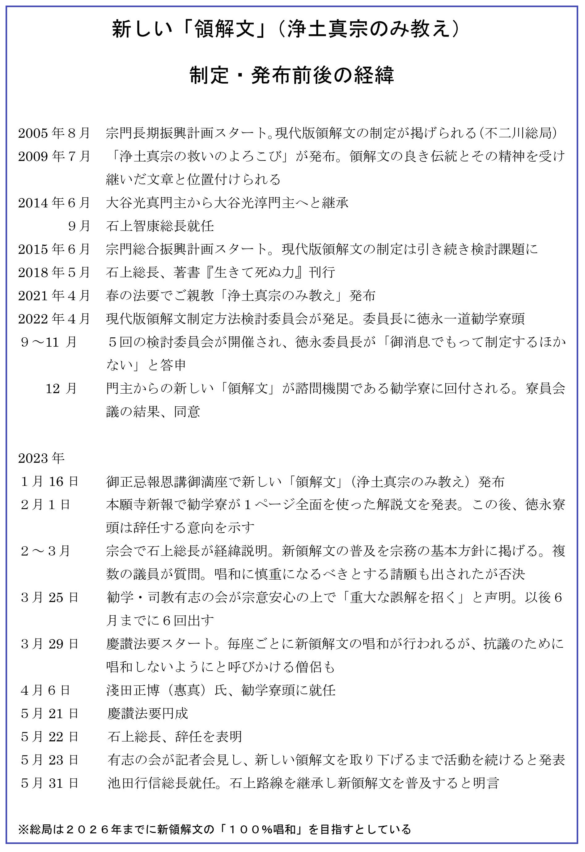 石上智康総長(当時)が今年2月の宗会で強調したように、現代版の領解文を作る方針は2005年の宗門長期振興計画から存在していた。ここから十数年の流れは、別表を参考。ともかく領解文の「意味が理解しにくくなってきた面がある」という問題意識は長くあったのは事実だ。