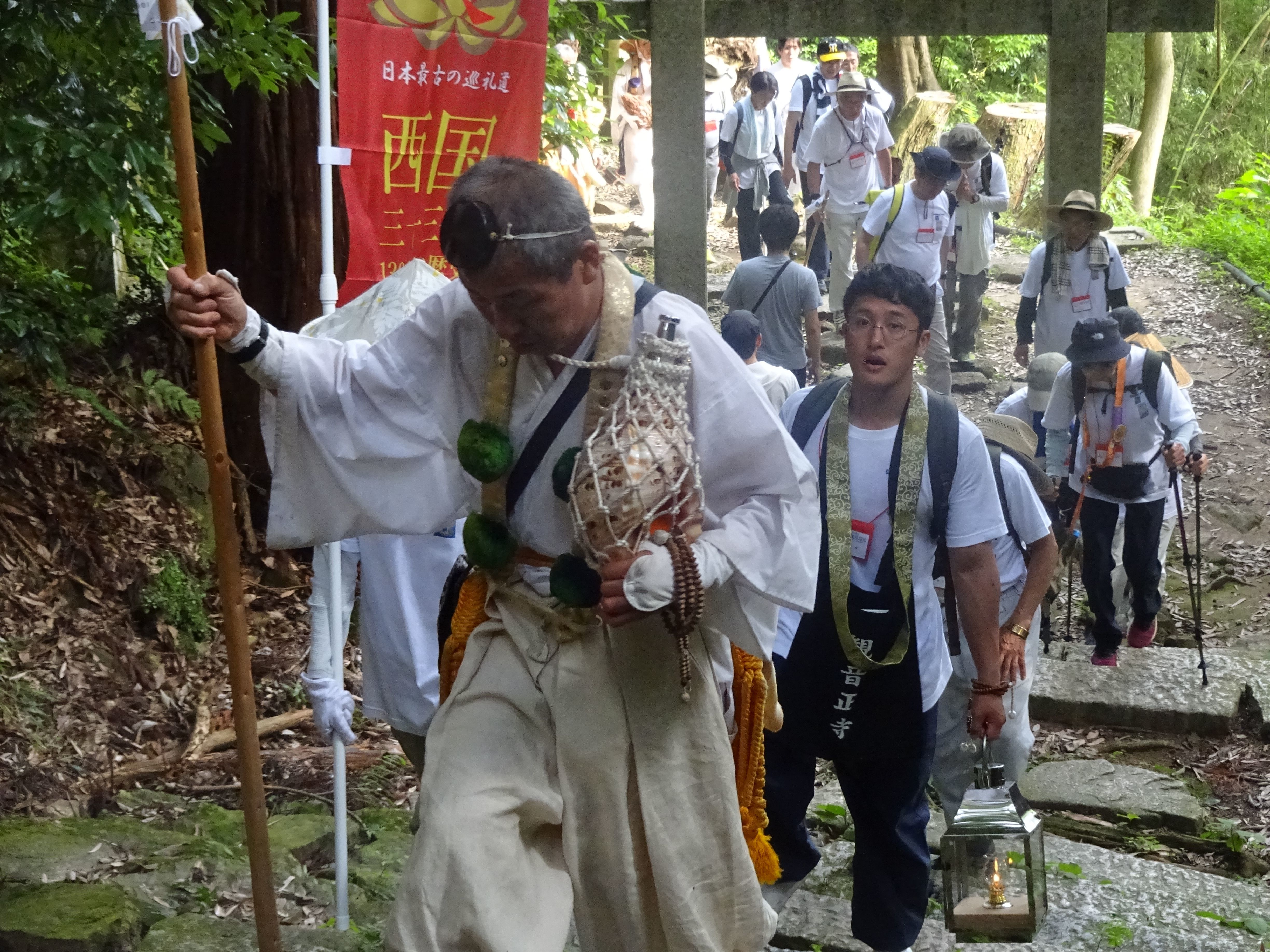 長命寺を登嶺。吊り灯籠を持つのが岡村副住職 日本遺産・西国三十三所とスペインサンティアゴ巡礼路の友好提携が4月に結ばれたことを記念し、日本とスペインの5つの巡礼路を同時に歩く空前の「同日巡礼」行事が18日に開催された。西国第32番観音正寺(滋賀県近江八幡市)の岡村遍導住職と、提携に尽力したスペインで活躍するピアニストの川上ミネさんらはサンティアゴ巡礼路を行脚。西国三十三所のほか、坂東三十三所、秩父三十四所の「日本百観音」、それに熊野古道の巡礼路を、信徒は世界の平穏を祈りながら歩んだ。