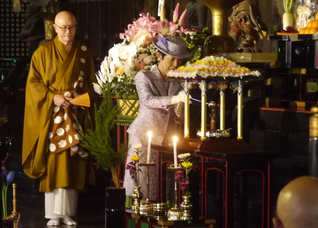 午後1時半、宗会議員ら職衆約20人と瀬川門跡が中門をくぐり、御室金剛講御詠歌隊と合流。相互供養和讃を詠唱しながら進列し、厳かに入堂した。導師と職衆が着座し、来迎「御室仁和寺第一番」の奉詠で堂内を華麗に荘厳。清浄な旋律の真言声明の中、いけばな御室流華道の生け込みと献華が行われた。