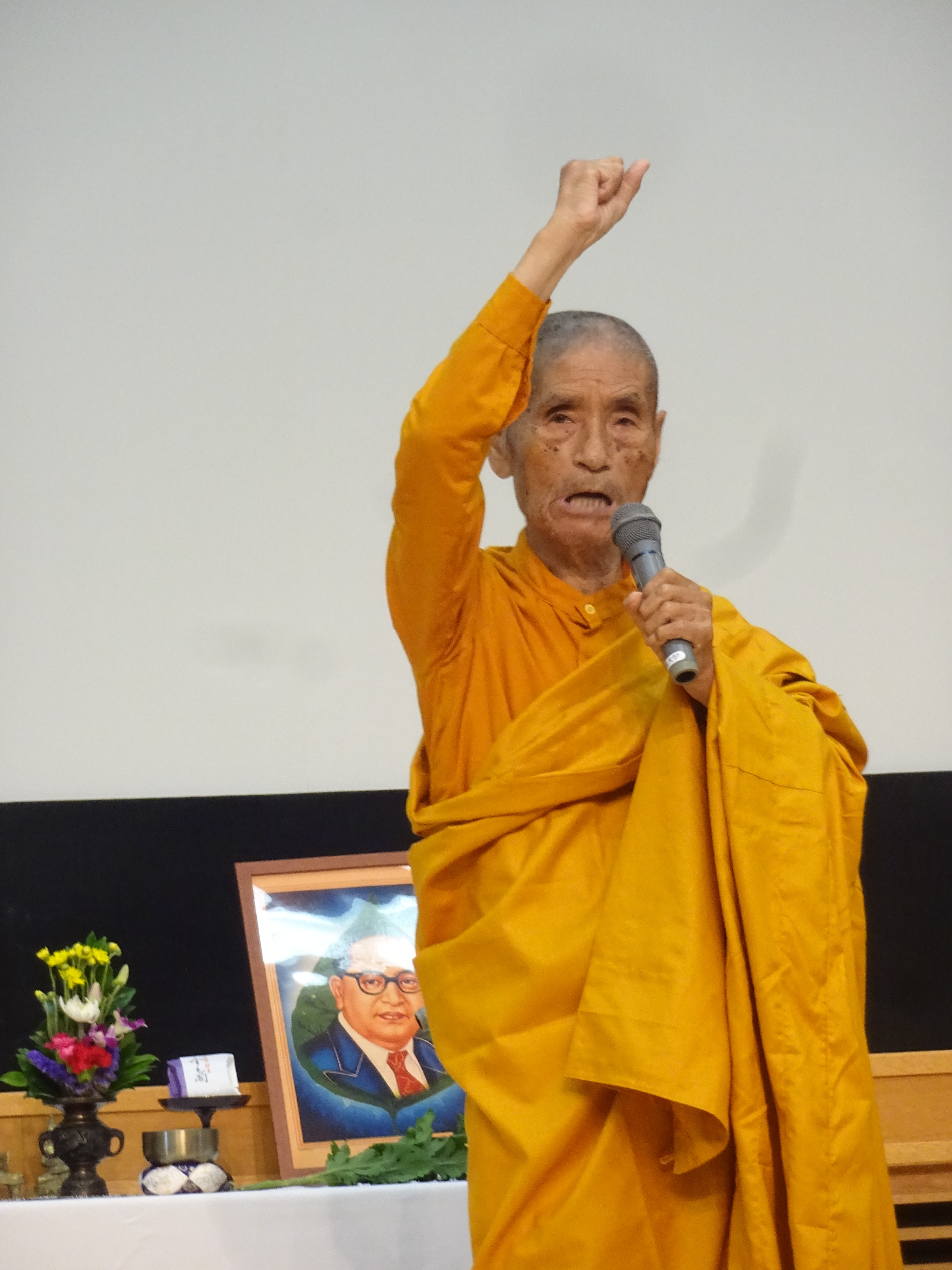 佐々井氏はまず、釈尊と、インド不可触民解放の父と呼ばれる憲法学者ビームラーオ・アンベードカルの肖像を前にした祭壇で法要を営み、拳を突き上げて会場と共にアンベードカル万歳を意味する「ジャイ・ビーム!」を叫んだ。この8月には88歳になる佐々井氏だが、天を貫くような力強い声は健在だった。