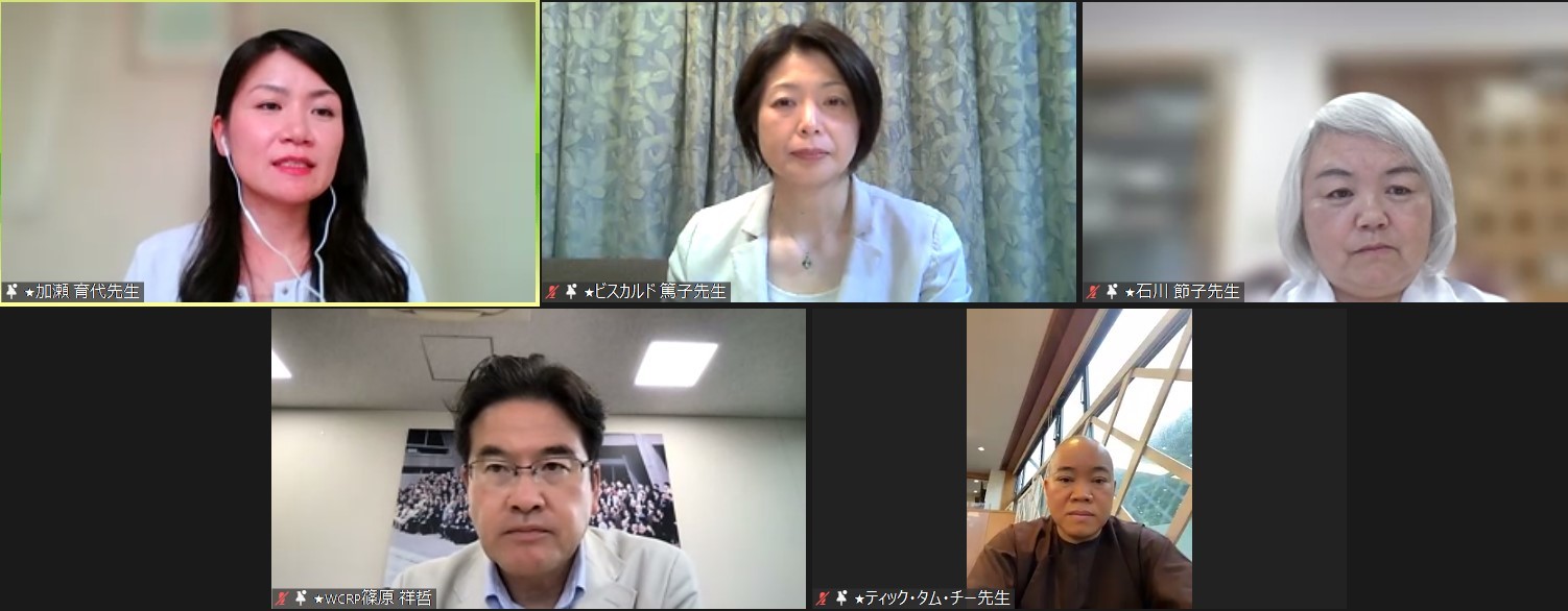 オンラインで開かれた学習会。司会(左上)と発題者の4氏 世界宗教者平和会議(WCRP)日本委員会の人身取引防止タスクフォースは1日、オンライン学習会「宗教者としていのちの尊厳について考える―国際人権とSDGs(持続可能な開発目標)の視点から人身取引防止を目指して」を開き、取り組みや啓発を行っている4人の宗教者が発題。国連が定めた7月30日の「人身取引反対世界デー」を前に理解を深めた。約85人が参加した。