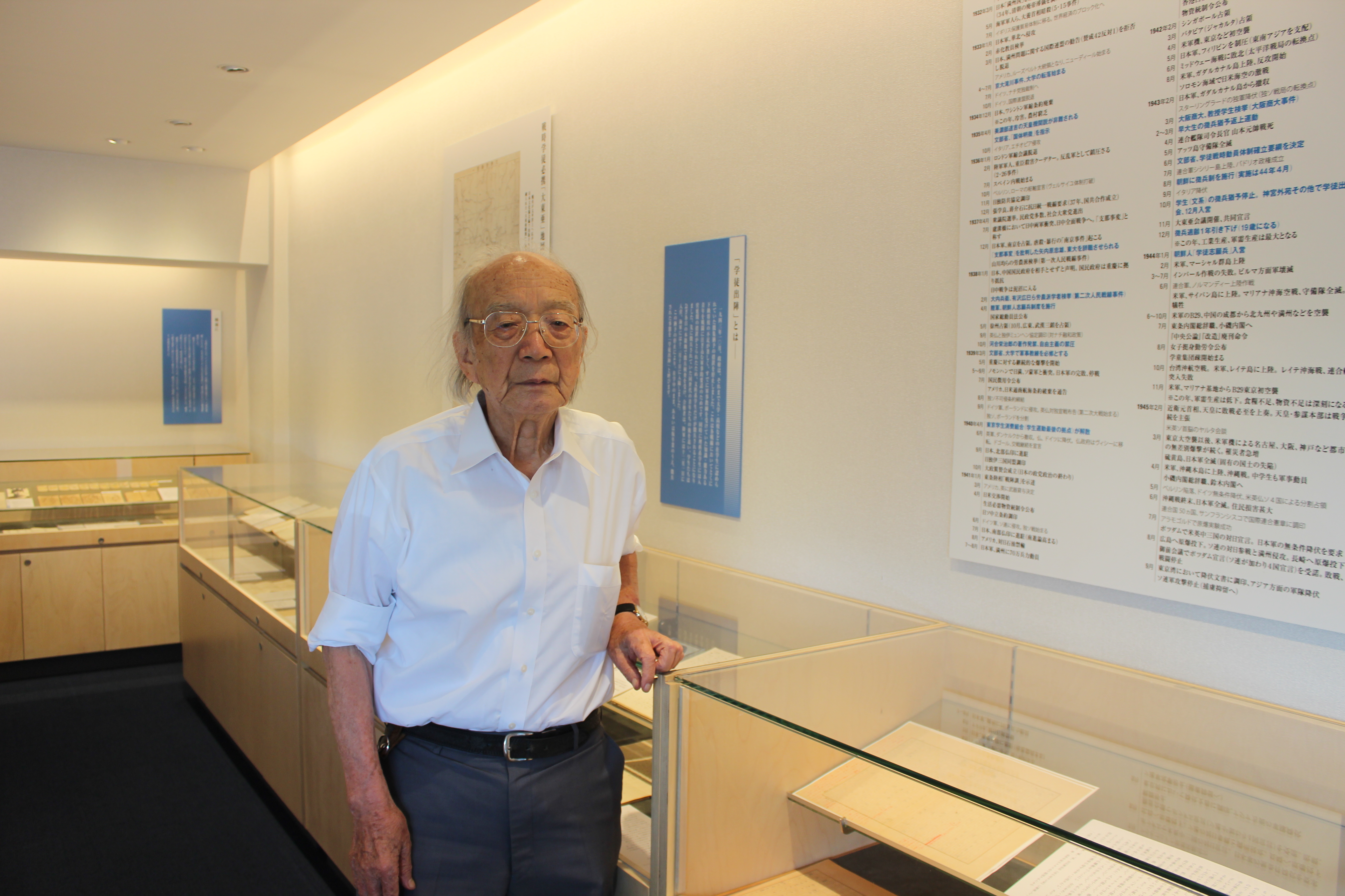展示物の前で「わだつみのこえ記念館」の岡田裕之館長。10月には95歳を迎えるが記憶力は抜群だ 東京・本郷の東大赤門近くに戦没学生たちの記録を展示する「わだつみのこえ記念館」がある。赤門アビタシオンビルの中の一室(1階と2階)。コンパクトな作りながら、残された手記は深く重いメッセージを発している。今年は学徒出陣から80年となり、東大五月祭では本郷キャンパス内で「戦没東大生の遺稿展」が開かれた。東大出身で今年10月に95歳となる岡田裕之館長(法政大学名誉教授、経済学者)が解説を担当した。学徒出陣80年と版を重ねている日本戦没学生記念会編『きけわだつみのこえ―日本戦没学生の手記』(岩波文庫、以下『わだつみ』)について岡田館長に取材した。