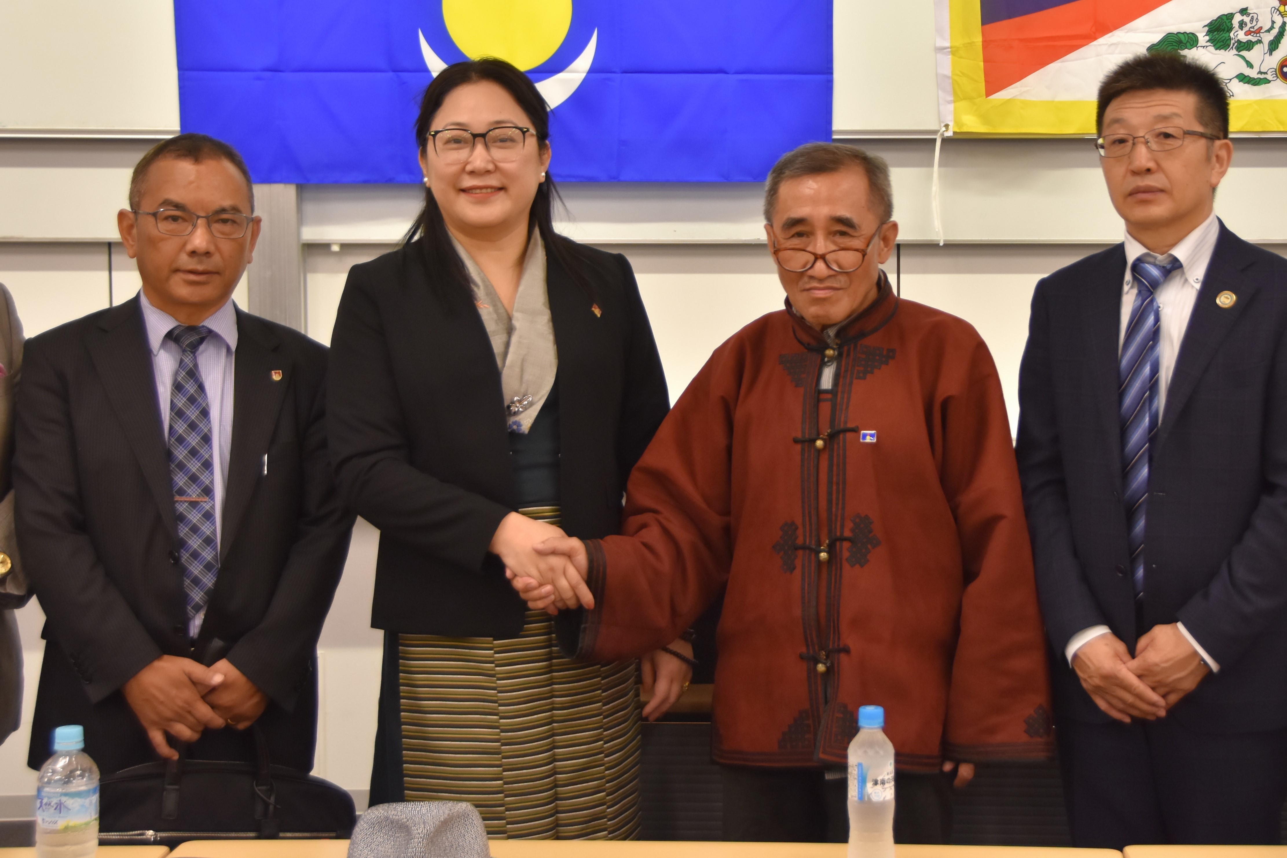 握手を交わすテムチルト氏(右から2人目)とドルマ氏(同3人目) チベットとモンゴルが互いの独立を承認した「チベット・モンゴル相互承認条約」の締結から今年で110年を迎えたのを記念し、東京都目黒区の東京大駒場キャンパスで15日、第2回モンゴル・チベット文化・宗教学術シンポジウムが開かれた。参加者約50人が、中国の仏教弾圧の歴史に対する認識を深めた。