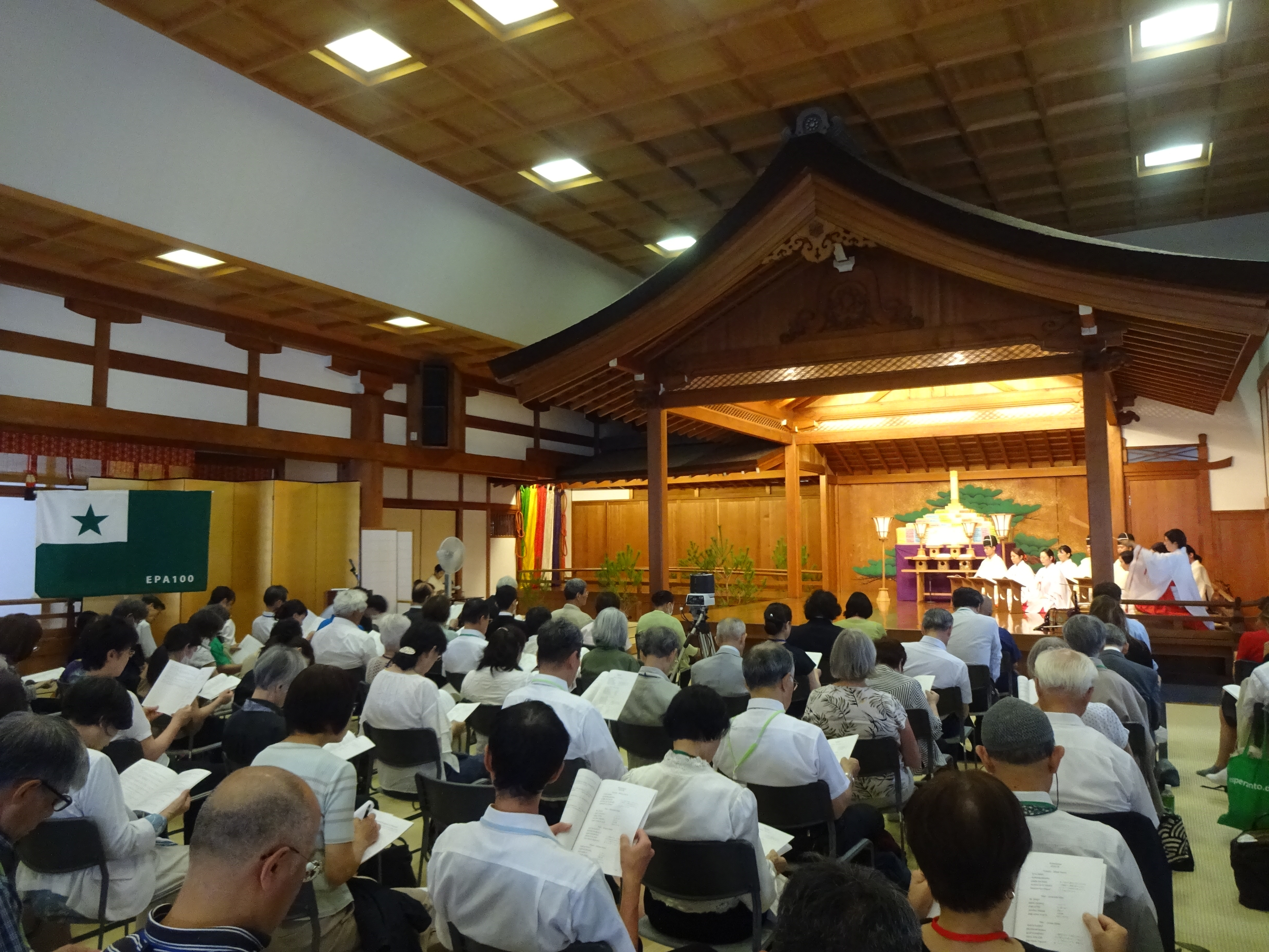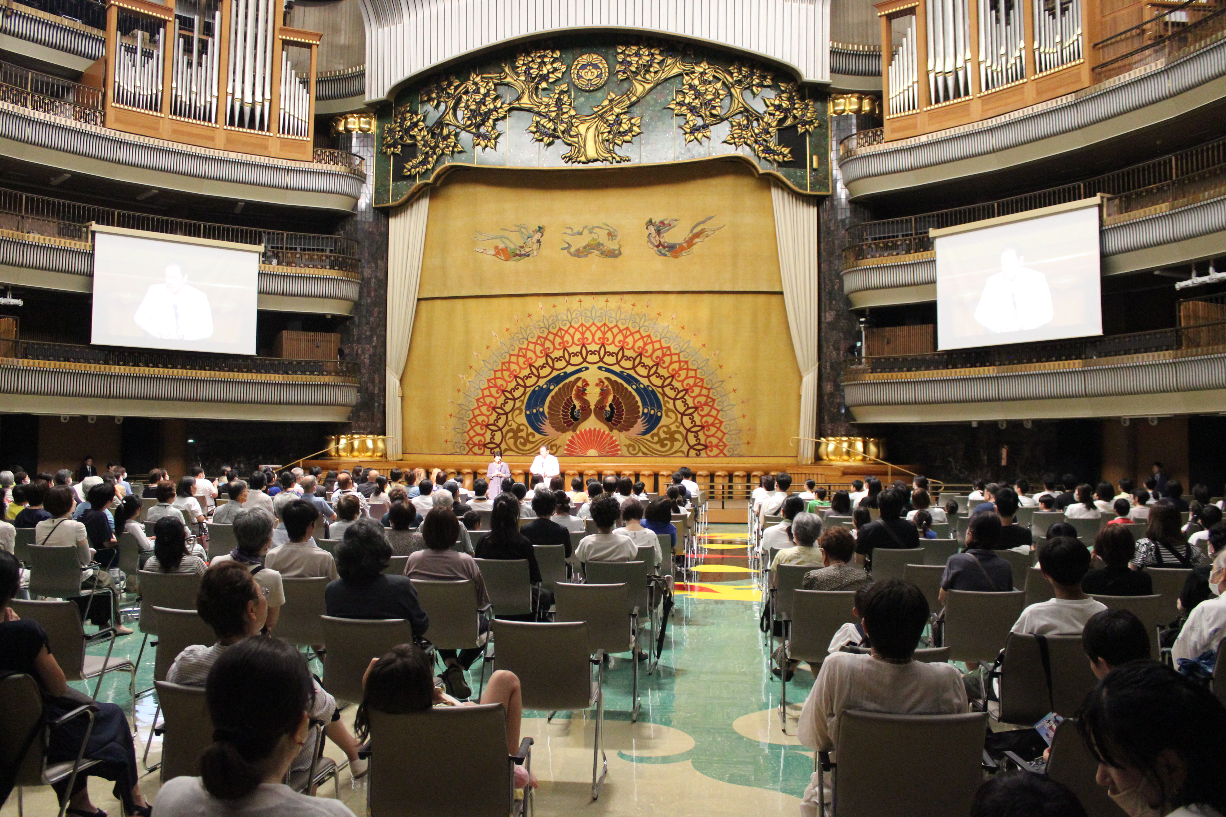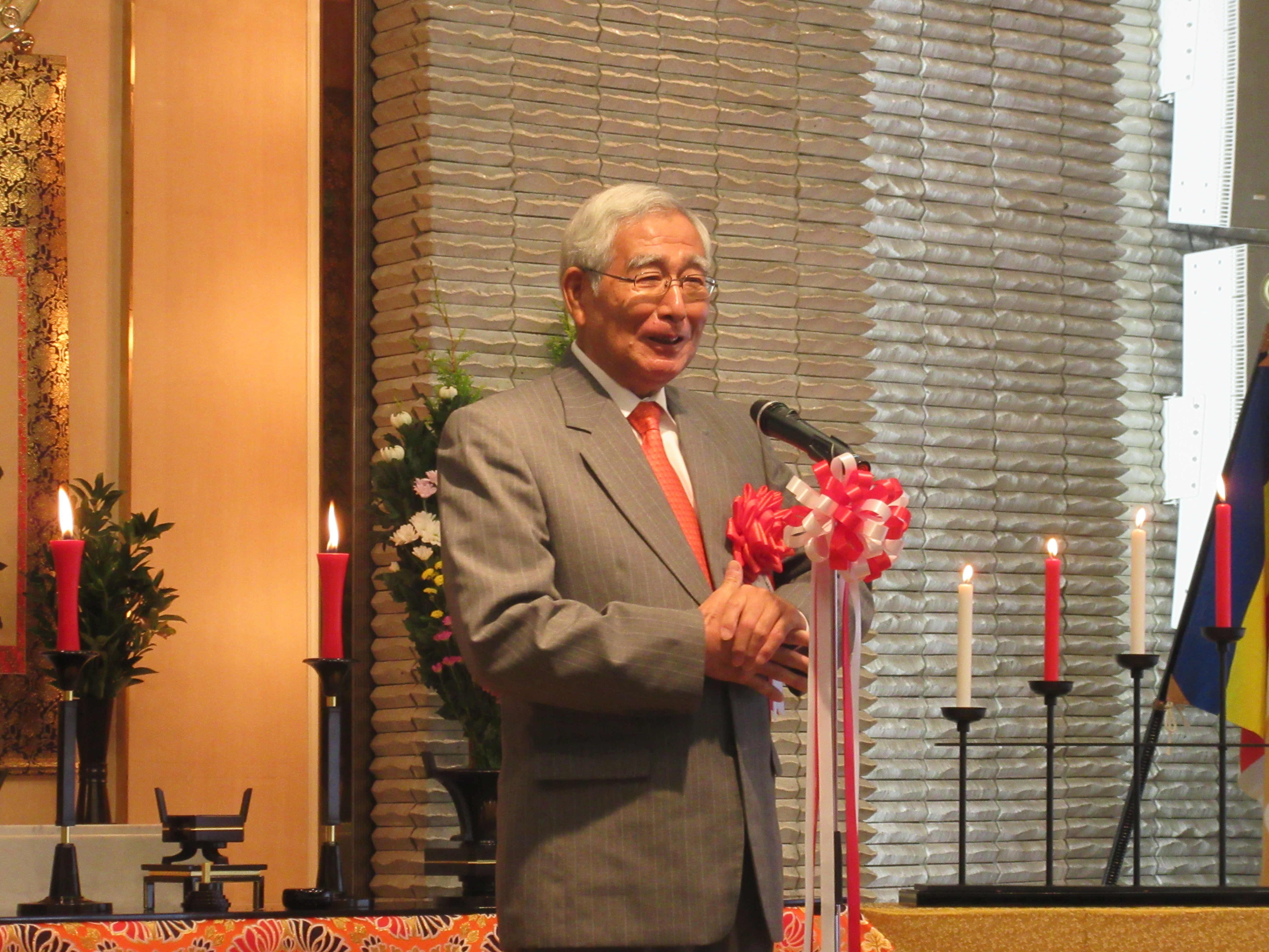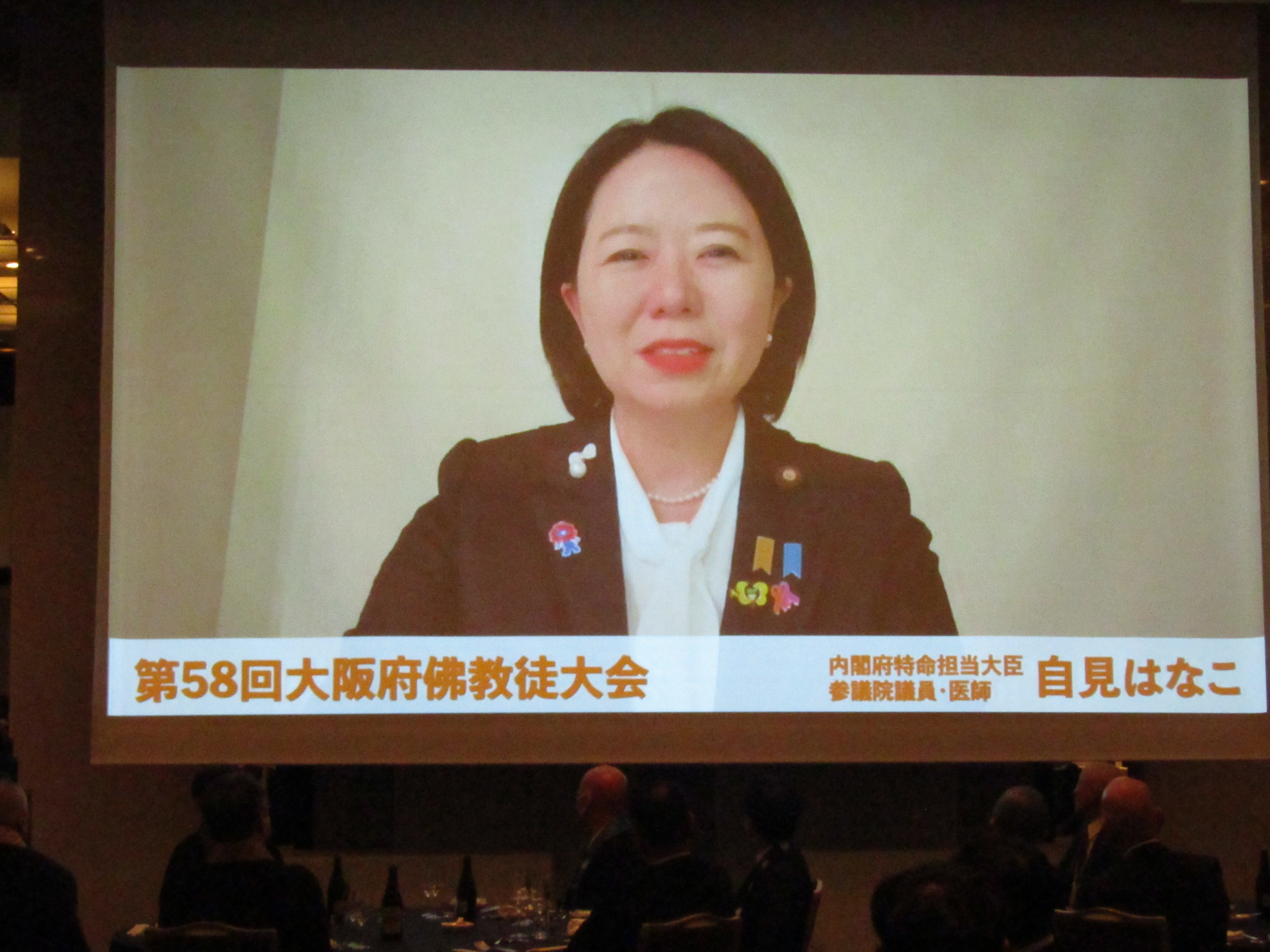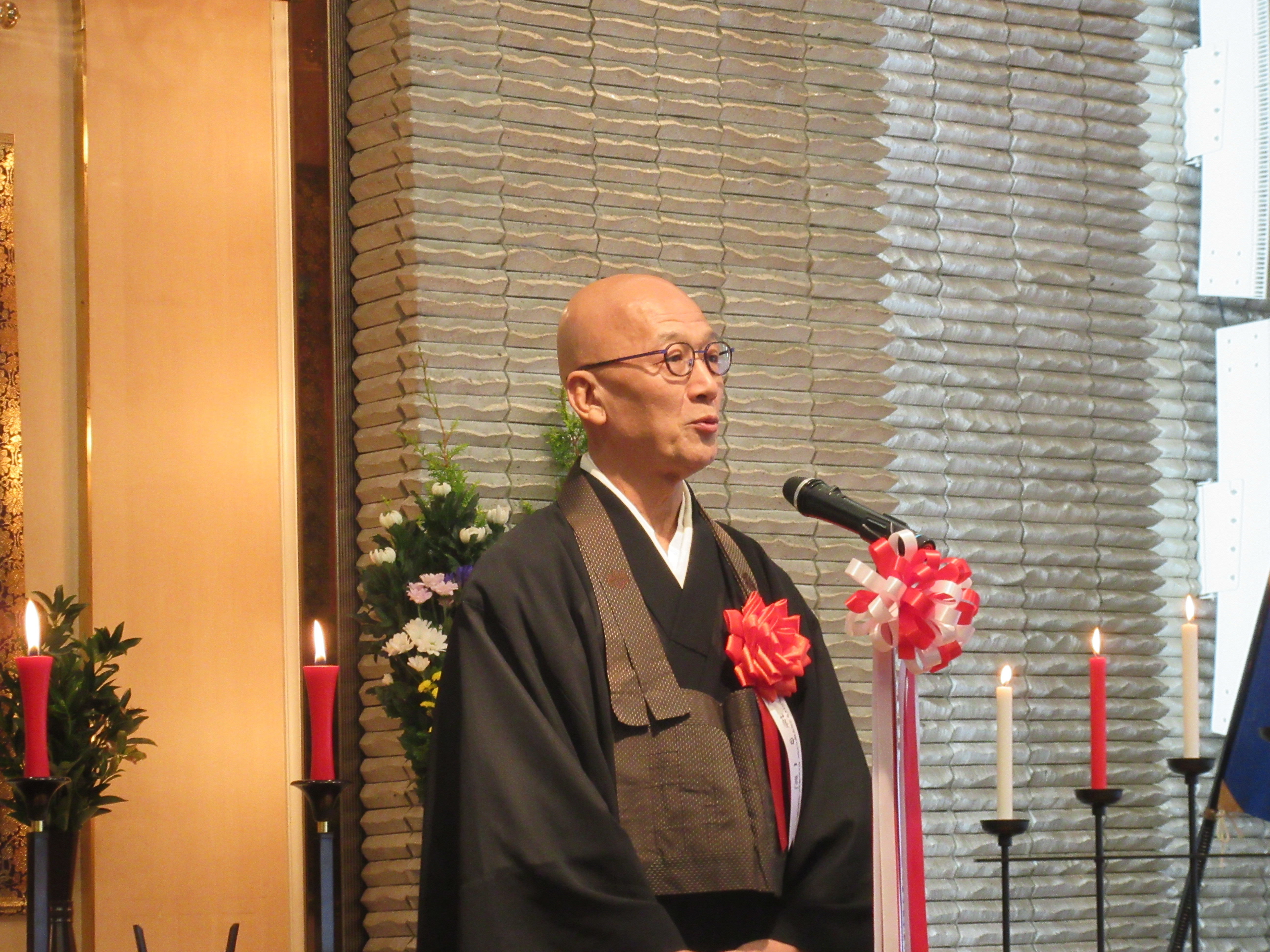 冒頭の全国災害物故者・会員物故者追悼法要は真宗高田派寺院が担当した。村山会長は開会にあたり、自坊の曹洞宗萩の寺東光院(豊中市)の萩の木は毎年、花の終わりの勤労感謝の日に株元まで刈り取るが、翌年にはまた美しく咲く「いのち」の流れがあると語り、さらに「東南アジアの仏教徒に接すると、向こうの人は無条件で輪廻転生を信じている」とし、こうした考えは釈尊の根本の教えであると指摘。