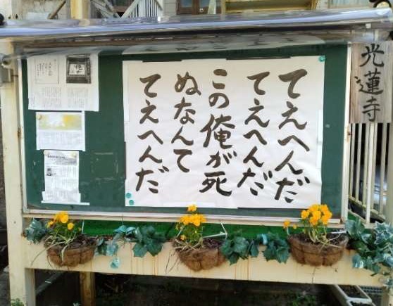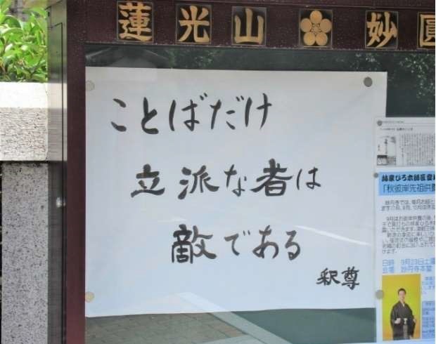 大賞を受賞した妙円寺の掲示板 お寺の掲示版を表彰する「輝け!お寺の掲示板大賞2023」(仏教伝道協会主催)の受賞作品が5日、同会ホームページで発表された。今年の仏教伝道協会大賞には大賞には日蓮宗妙円寺(東京都渋谷区)の「ことばだけ立派な者は敵である 釈尊」(撮影者アカウント名@renkouzan)に決まった。また仏教タイムス賞は光蓮寺ビハーラハウス(岩手県盛岡市)の「てえへんだ てえへんだ この俺が死ぬなんて てえへんだ」(同@akilayoshida)が受賞した。