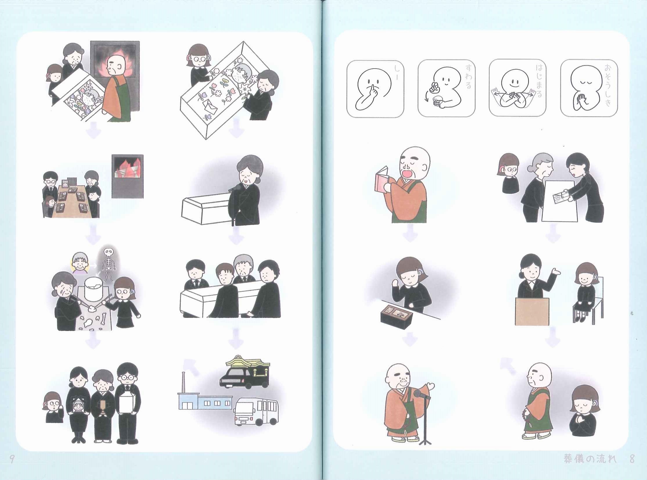 葬儀の流れや手話のイラストが豊富な絵本 絵本づくりは昨年秋にスタート。真言宗以外の葬儀も知るために、同年春から所属する仏教情報センターにアドバイスを求めた。当初はお経の意味や各宗派の教えも盛り込まなければと考えていたが、「子どもたちの気持ちに寄り添うほうが大切」との声が多かった。