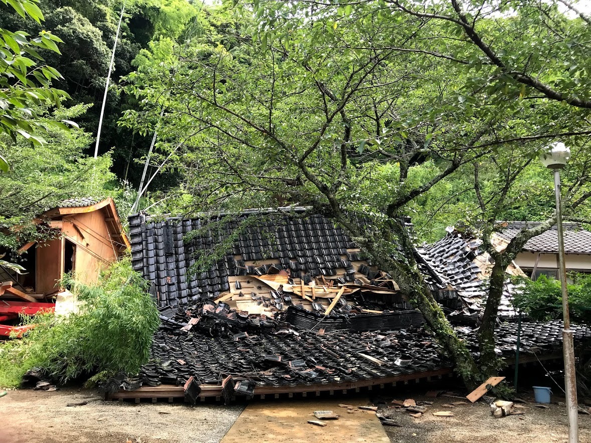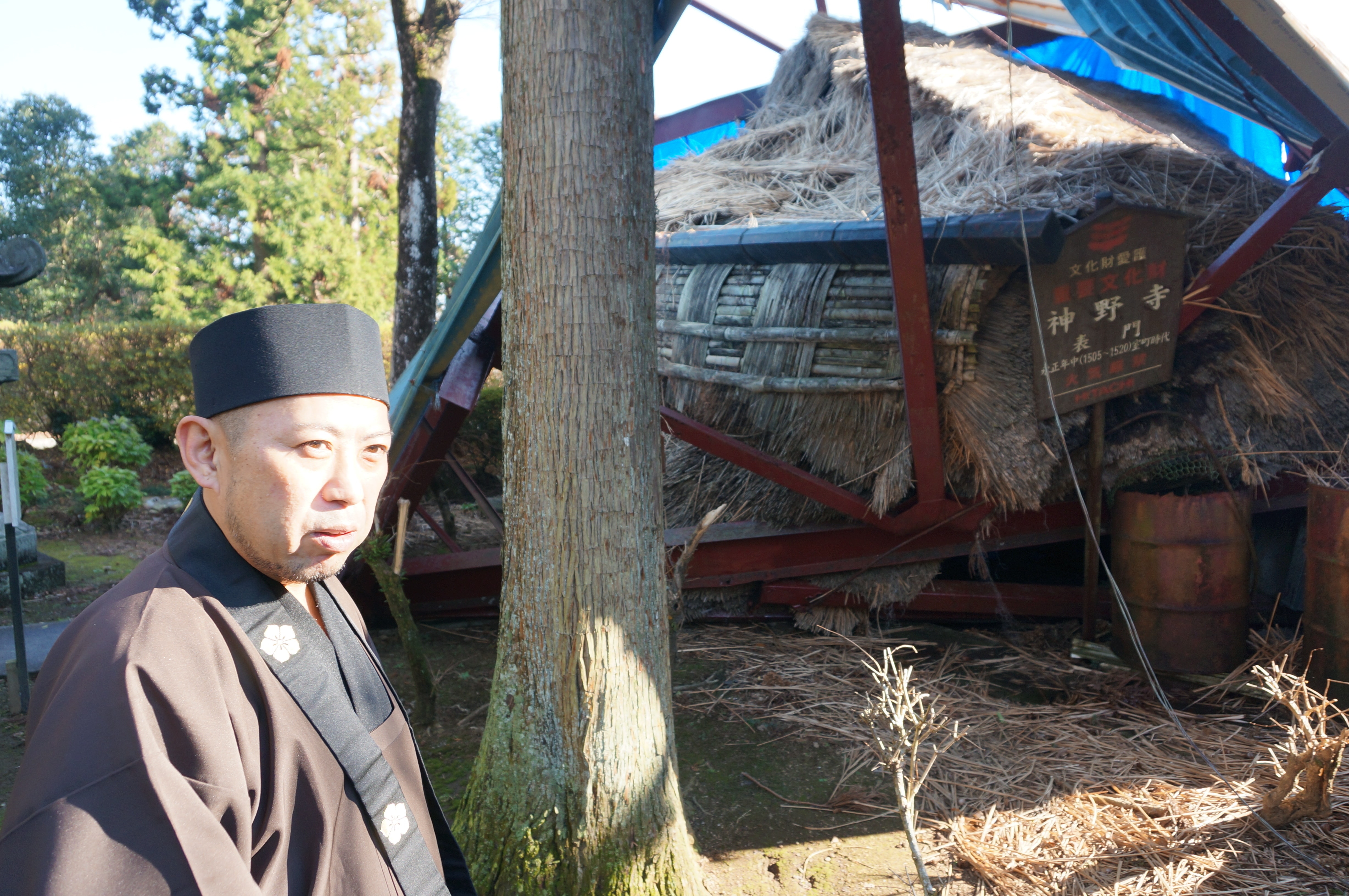 台風が通過した朝、院代を務める岩間照種副住職(47)が目にしたのは、荒れ果てた寺の姿だった。境内全域も枝や枯葉で覆われ、岩間副住職は「まるで絨毯のようだった」と話す。寺のシンボルの一つであった国指定重要文化財の表門は、雨風をしのぐ鉄の保護屋根もろとも倒壊していた。
