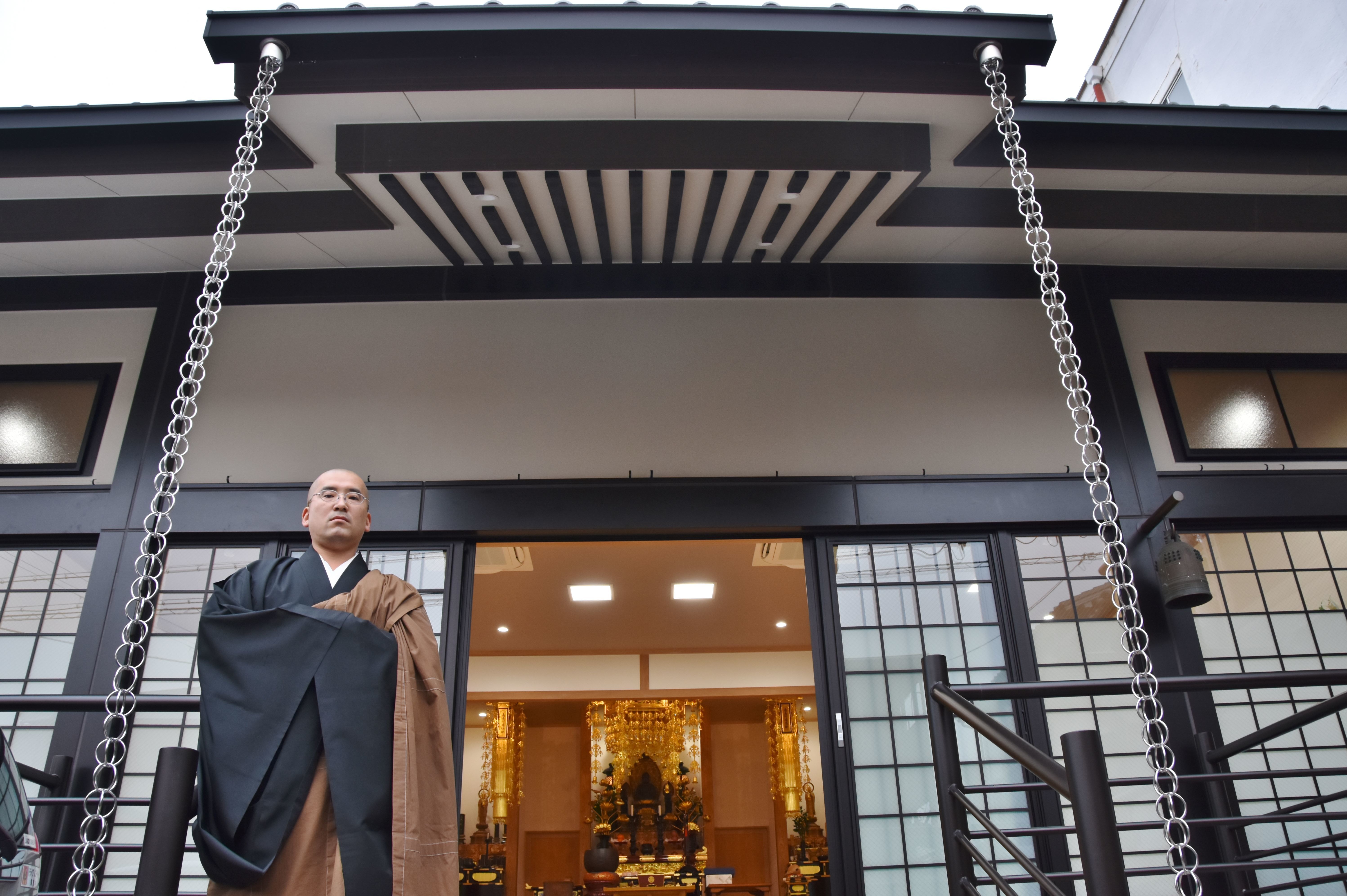 今秋に落慶法要を控えるのは、神戸市長田区の浄土宗極楽寺。8年前に30歳で住職に就任した伊藤仁明住職(38)は、「この間、建て替えのことで頭がいっぱいだった」。4月に完成した真新しい本堂は鉄骨平屋建ての約121平方メートル。「人が集まってくれるように」と、伊藤住職の工夫がこらされる。