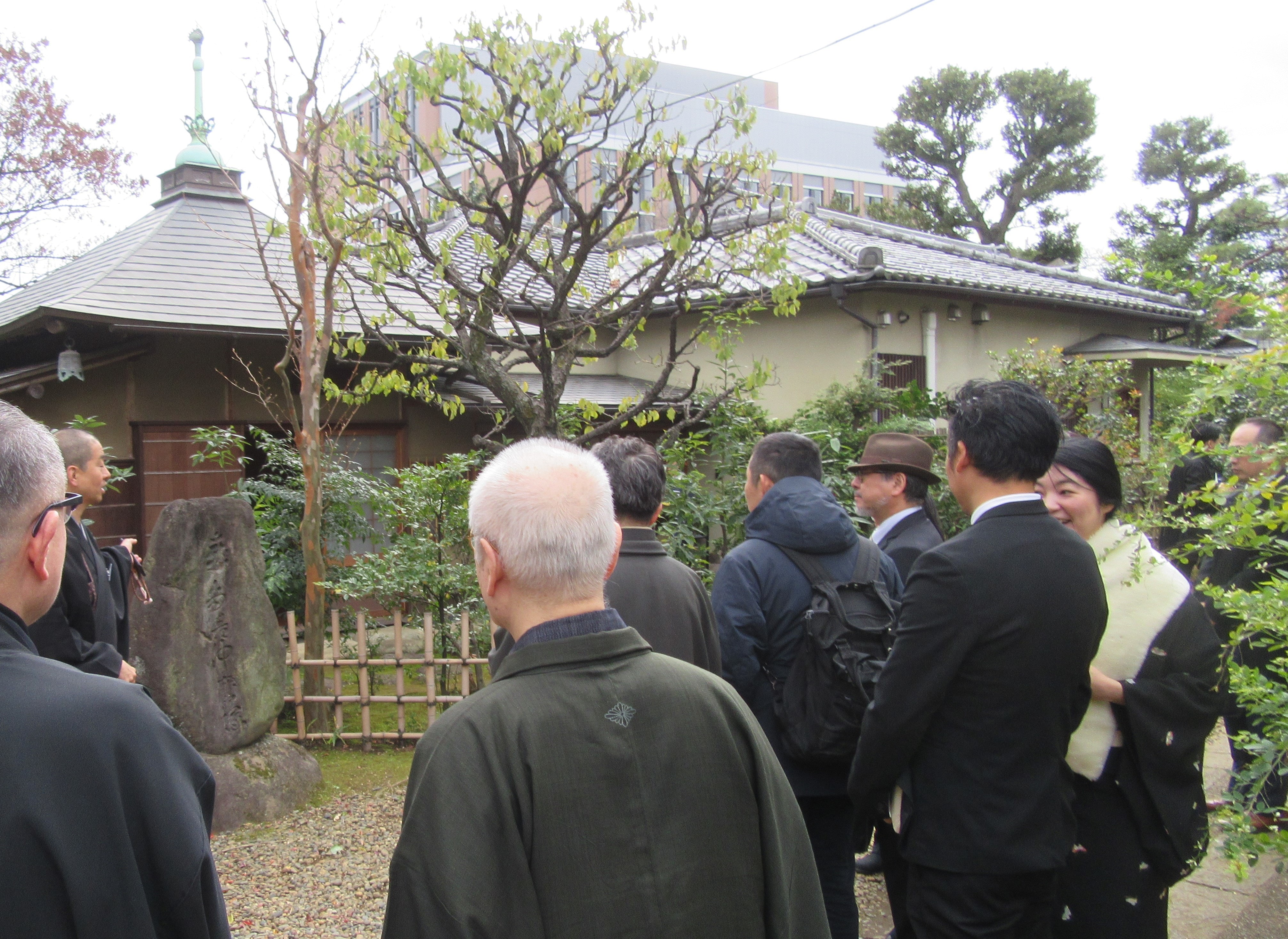 仲麿堂の内覧会でお堂や仲麿塚を見学した参加者 真言宗豊山派大本山護国寺(文京区)で12月12・13・16・17日に、茶道関係者や文化人らを招いて、仲麿堂・箒庵・三笠亭の内覧会が行われた。4日間で約120人が訪れた。