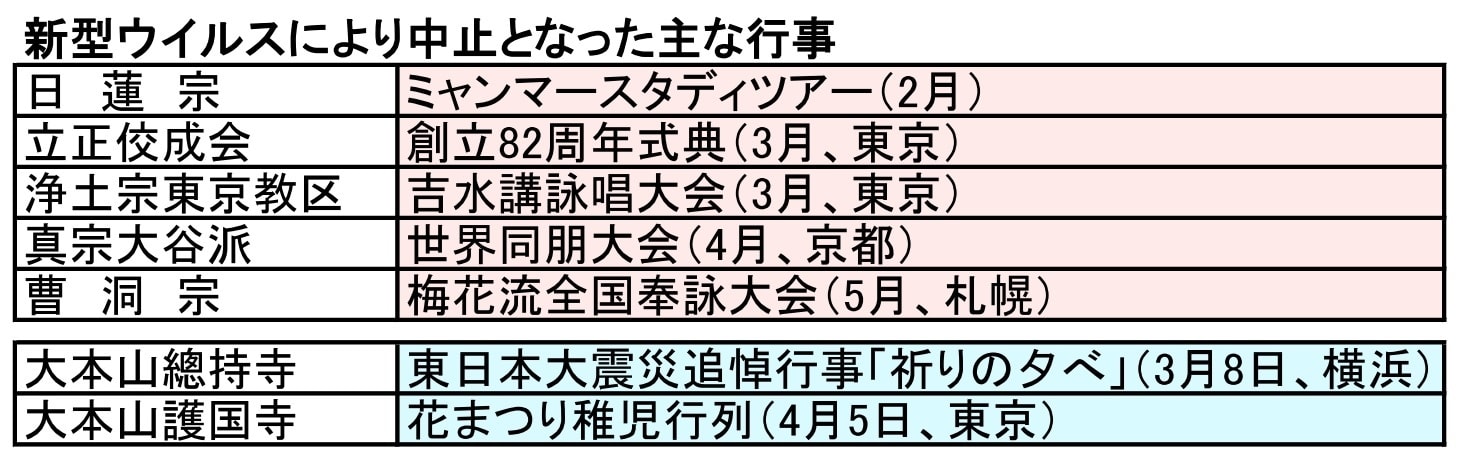 同様にワンテーマは、すべての教団や寺院、宗教者に対応を要求した。2月6日に集団感染を起こしたダイヤモンドプリンセス号が横浜港に寄港してから日本では強く意識され始めた。宗教界では2月20日頃から教団行事の見直しや延期、中止の発表が相次いだ。同時に、コロナや疫病退散の祈願が各地の寺院などで始まるようになった。