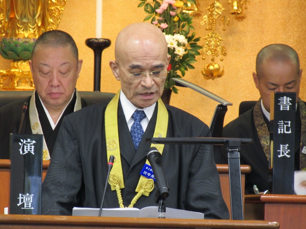 ジェンダー研究の取り組みなどを報告する三神総長 真言宗智山派(三神栄法宗務総長)の第141次定期教区代表会(深澤照生議長)が21~23日、京都市東山区の総本山智積院内宗務庁に招集された。寺族の中で女性に限定される「寺庭婦人」の呼称を宗制上から撤廃し、住職・前住職らの親族で性別不問の「寺族」に統一。「寺庭婦人規程」を廃止して「寺族規程」を新設し、各寺院の事情に応じて寺族の中から男女を問わずに寺族代表者を1人選定することになった。〝寺庭男性〟と呼ぶべき女性住職の配偶者が増える現状に対応した措置。