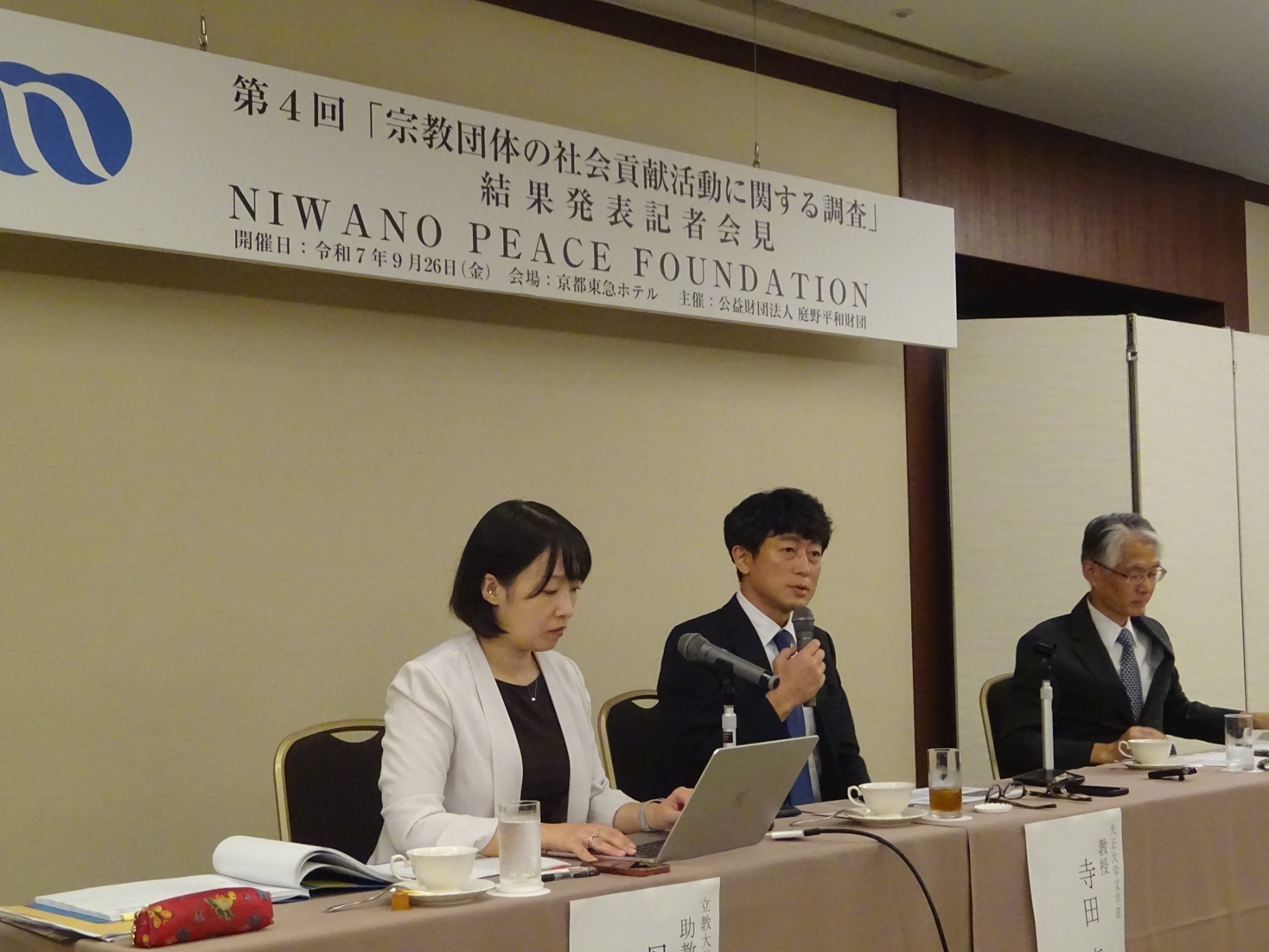 (左から)宮城、山崎、榎本、福家4氏がパネル討論 「国連軍縮週間に呼応する日本宗教者平和会議」(主催=日本宗教者平和協議会)が20日、京都市東山区の音羽山清水寺大講堂圓通殿で開催され、宗教者や市民ら約180人が参加した。テーマは「戦後・被爆80年 核兵器も戦争もない世界を・宗教者の願い」。日本原水爆被害者団体協議会(日本被団協)の田中煕巳(てるみ)代表委員(長崎被爆者)が、「被爆者の運動とノーベル平和賞受賞の意義」と題して記念講演を行い、それを受けてのシンポジウムでこれからの平和活動のあり方を討議した。