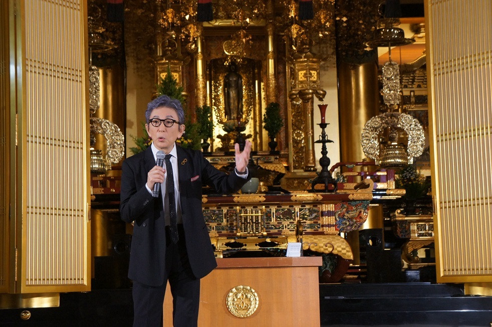 ミツトヨ取締役専務執行役員の佐々木繁幸氏が祝辞。ミツトヨを創業し、精密測定器の分野で世界的な企業を築き上げた惠範氏の人生の柱に「仏教への深い信仰」があったとしたうえで、「企業の成功は社会に還元するための手段である」という師の言葉を紹介。現在も利益の一部を仏教伝道や様々な社会貢献に活用していることを報告し「惠範氏の志が今も引き継がれている証。単なる資金提供という枠を超えた、志をもった社会貢献の象徴」と胸を張った。技術革新による新たな仏教伝道の可能性にも言及しながら「仏教の精神を次世代へと継承するみなさまのご努力に感謝し、仏教の教えがさらに世界に広まることを祈念します」と祝した。