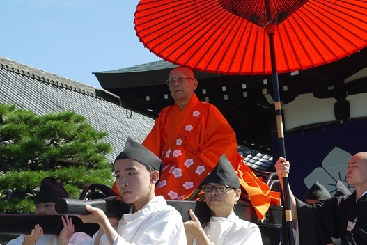 大本願に向けてお練りする川名法主 長野市の浄土宗大本山善光寺大本願で10月24日、鷹司誓玉法主の退任式と川名観恵法主(85)の晋山式が営まれた。122世の法燈を継いだ川名法主は「ご縁をいただいた皆さまと手を取り合って法燈を守るため精進したい」と誓った。
